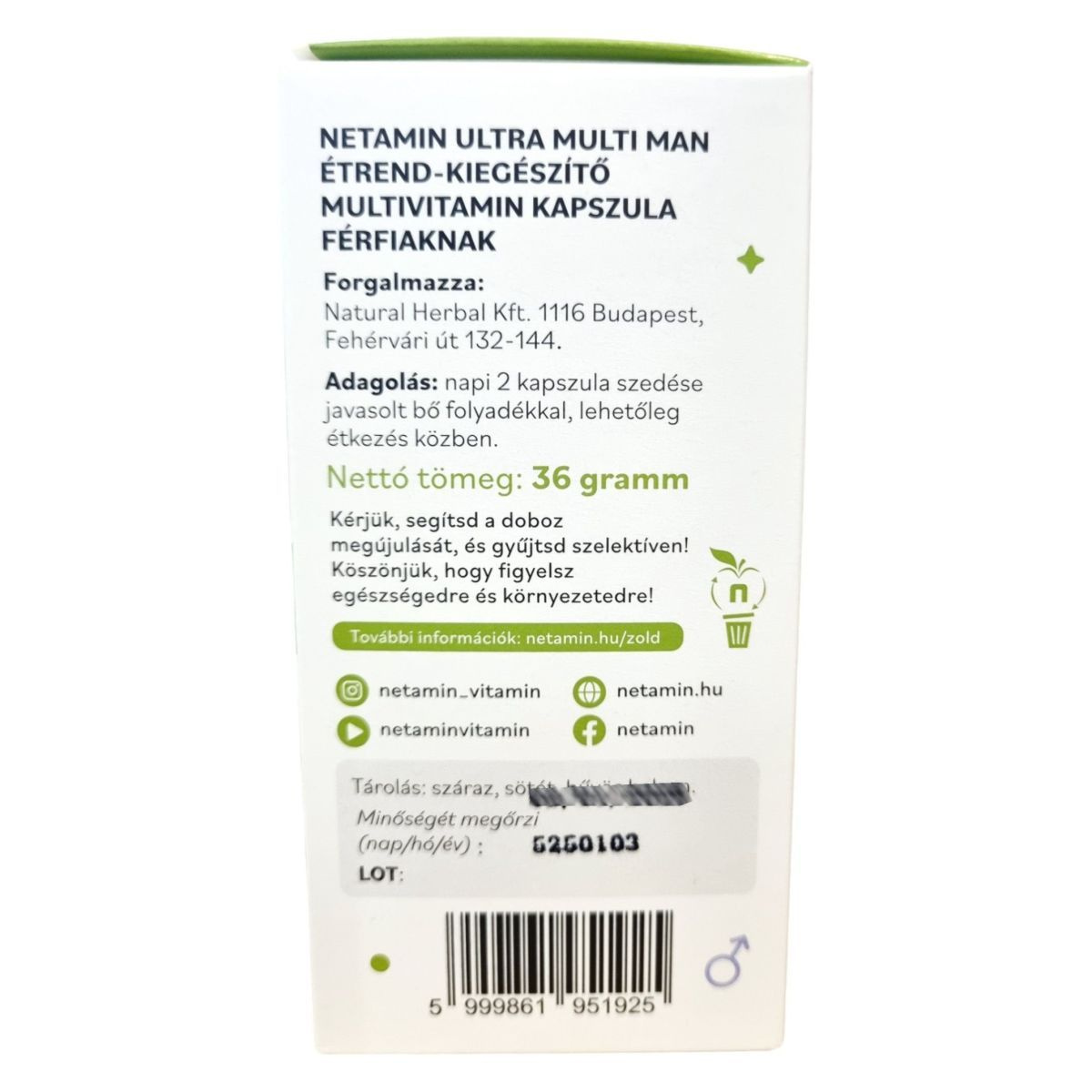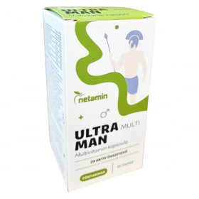 A Netamin ULTRA MAN MULTI multivitamin kapszula kifejezetten férfiak számára készült, 29 aktív összetevővel, amelyek vitaminokat, ásványi anyagokat és gyógynövény-kivonatokat tartalmaznak. A termék célja lehet az immunrendszer támogatása és a fáradtság csökkentése. A cink hozzájárulhat a vér normál tesztoszteron szintjének fenntartásához, míg a D-vitamin az immunrendszer normál működéséhez. A termék használata során fontos, hogy ne lépjük túl az ajánlott napi adagot, és tartsuk be az egészséges életmód alapelveit. A kapszulák növényi alapúak, és a termék összetevői között megtalálhatóak a C-, B2-, B6-, B12-vitaminok, folát, niacin és pantoténsav, amelyek hozzájárulhatnak a fáradtság és a kimerültség csökkentéséhez.