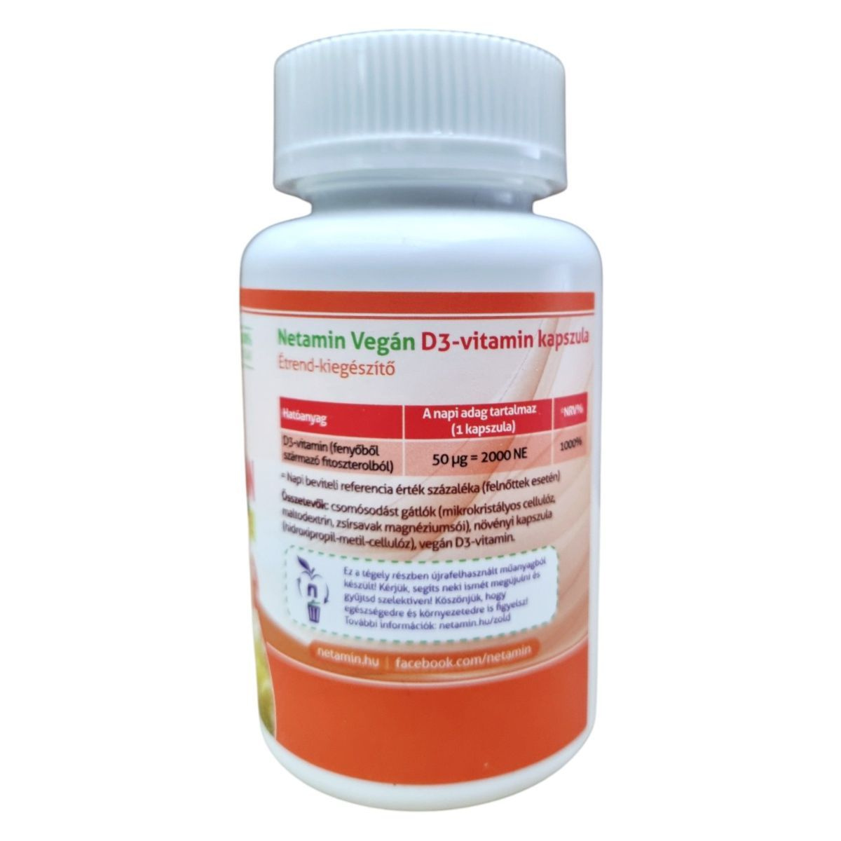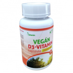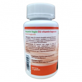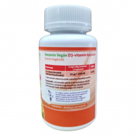 A Netamin Vegán D3-vitamin kapszula egy 100% vegán étrend-kiegészítő, amely fenyőből származó fitoszterolból előállított D3-vitamint tartalmaz. A termék napi adagja 50 µg D3-vitamint biztosíthat, ami a napi beviteli referencia érték 1000%-ának felelhet meg. A kapszulák növényi alapúak, és a termék részben újrahasznosított műanyagból készült tégelyben kerül forgalomba, ezzel is támogatva a környezetvédelmet. A termék fogyasztása hozzájárulhat az immunrendszer normál működéséhez, valamint az egészséges csontozat és izomfunkció fenntartásához. Kérjük, a terméket szelektív hulladékgyűjtőbe helyezze el használat után.