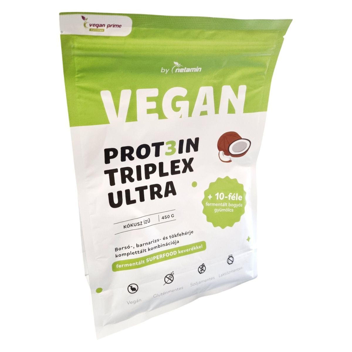 A Netamin VEGAN PROT3IN TRIPLEX ULTRA egy kókuszízű vegán fehérje alapú italpor, amely borsó-, barnarizs- és tökfehérje kombinációját tartalmazza, kiegészítve 10-féle fermentált bogyós gyümölcs keverékével. A termék könnyen emészthető és változatosan felhasználható, például turmixokhoz vagy sütéshez. A termék nem tartalmaz glutént, szóját, laktózt, színezéket, tartósítószert és állati eredetű összetevőt, így különösen alkalmas vegán étrendet követők számára. A termék 450 grammos kiszerelésben kapható, amely 15 adagot tartalmaz.