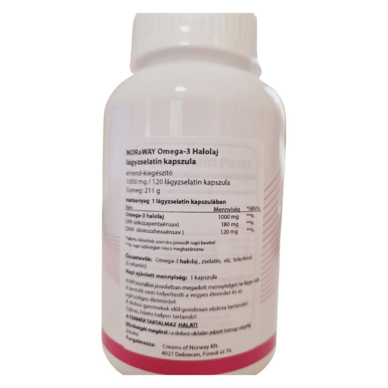 A NORaWAY Omega-3 Halolaj lágyzselatin kapszula egy étrend-kiegészítő, amely 1000 mg Omega-3 halolajat tartalmaz kapszulánként. Az EPA és DHA zsírsavak hozzájárulhatnak a szív és az agy egészségének támogatásához. A termék napi ajánlott mennyisége egy kapszula, amelyet étkezés előtt, vízzel javasolt bevenni. A termék halat tartalmaz, ezért halallergiások számára nem ajánlott. A kapszulák tárolása száraz, hűvös helyen javasolt, és fontos, hogy gyermekek elől elzárva tartsuk. A termék forgalmazója a Creams of Norway Kft., Debrecen.