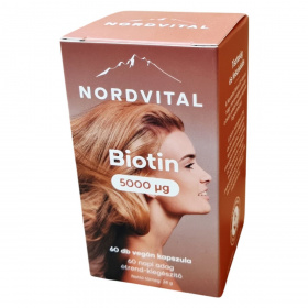 A Nordvital Biotin (B7-vitamin) kapszula 5000 µg biotint tartalmaz kapszulánként, támogatva a biotin pótlását. A kapszula vegán összetételű, rizslisztből és hidroxipropil-metil-cellulózból készül, a csomósodás gátlására leucin aminosavat tartalmaz. A termék 60 napi adagot biztosít 24 g nettó tömeggel. Az étrend-kiegészítő laktóz-, allergén-, glutén- és GMO-mentes, valamint GMP-minősítéssel rendelkező gyártóüzemben készül, amely megfelel a hatósági előírásoknak. A termék célja a normál bőr- és hajállapot fenntartásának, valamint az energia- és makrotápanyag-anyagcsere, az idegrendszer és a pszichológiai működés támogatása a megfelelő biotin ellátás biztosításával.