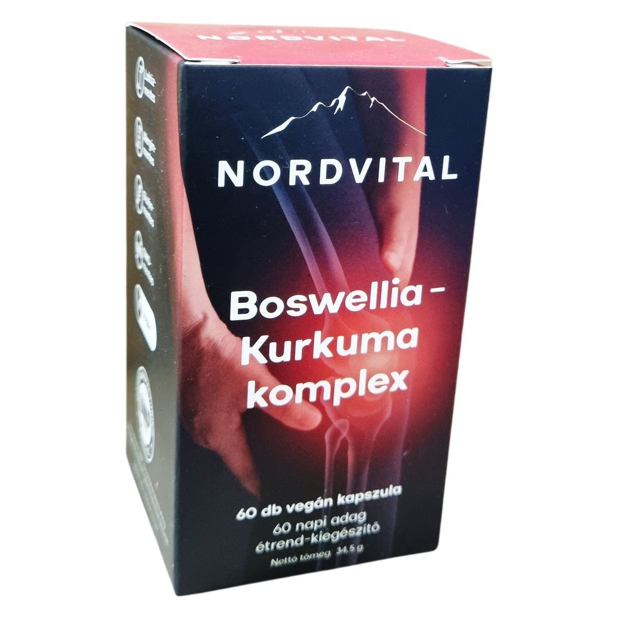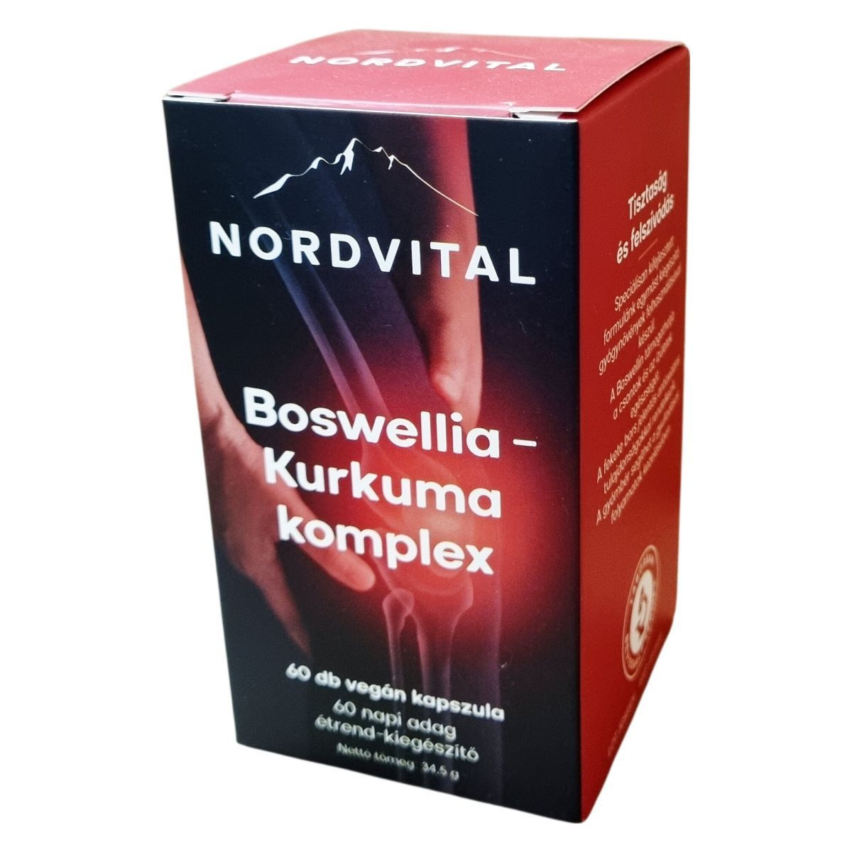 A NORDVITAL Boswellia - Kurkuma komplex étrend-kiegészítő speciális formulán alapul, amely természetes gyógynövényekből készül. A Boswellia hozzájárulhat a csontok és az ízületek egészségéhez, a fekete bors jelentős antioxidáns tulajdonságokkal rendelkezik, míg a gyömbér segítheti a gyulladásos folyamatok kezelését. A termék GMP minősített gyártóüzemben készül, laktóz-, allergén-, glutén-, GMO-mentes, és vegán étrendbe is beilleszthető kapszula formában érhető el. Tartalmaz shiitake és pecsétviaszgomba kivonatokat is, amelyek hozzájárulhatnak a szervezet támogatásához. A termék kapszulái hidroxipropil-metil-cellulóz alapúak, így megfelelnek a vegán életmód követelményeinek.
