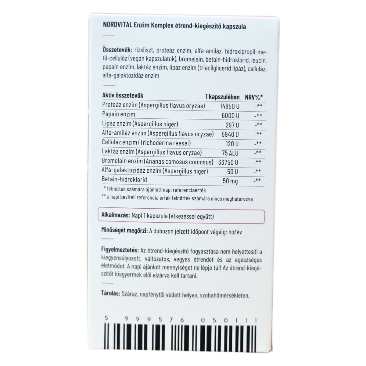 Az Enzim Komplex kapszula 60 napi adagot tartalmaz, nettó tömege 46,3 g. GMP tanúsítvánnyal rendelkező, jó gyártási gyakorlattal készült, laborban bevizsgált termék. A kapszula fermentált növényi eredetű enzimeket és kiegészítő összetevőket tartalmaz, melyek együttműködése segítheti az emésztést. A termék vegán étrendhez is alkalmas, és az összetevők között megtalálható többek között a bromelain, papain, laktáz és lipáz enzimek is. Az ajánlott fogyasztás napi egy kapszula, amelyet étkezés közben célszerű bevenni.