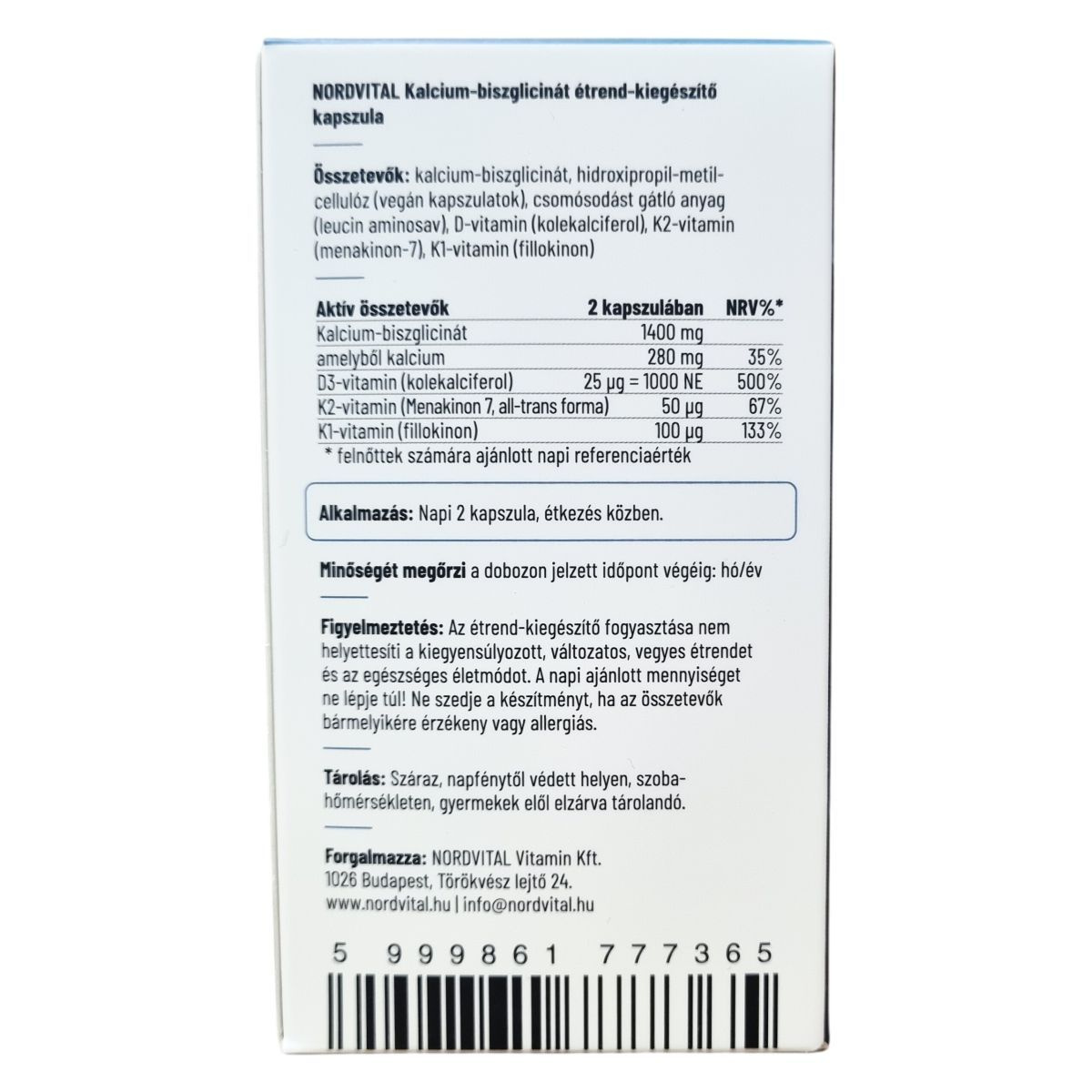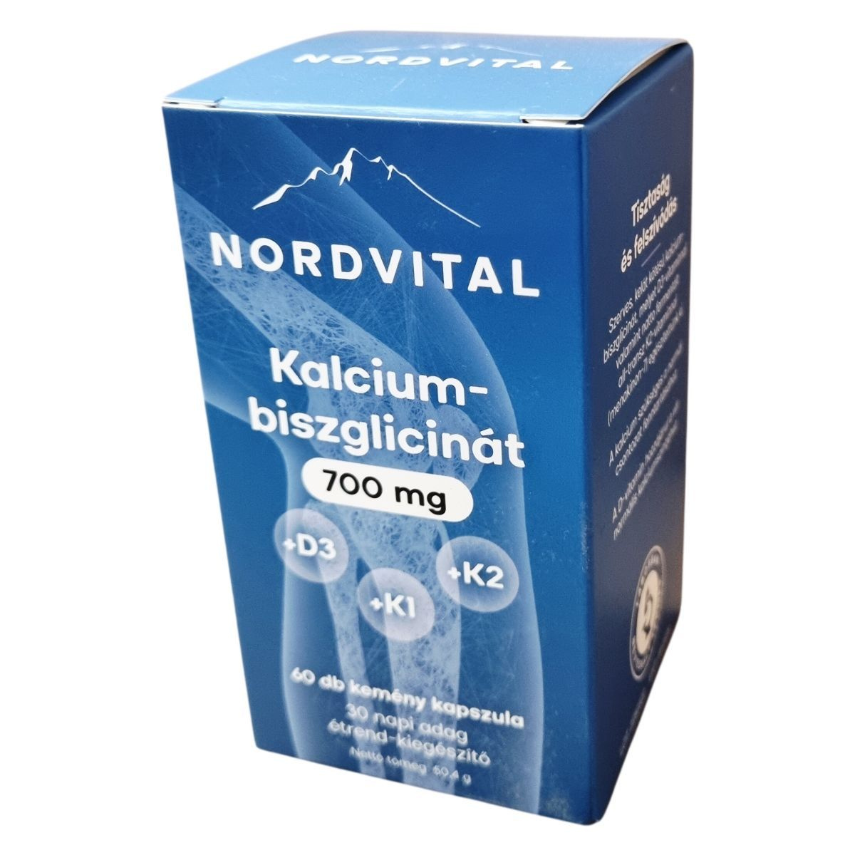 A NORDVITAL Kalcium-biszglicinát étrend-kiegészítő szerves kelát kötésű kalcium-biszglicinátot tartalmaz, amelyhez D3-vitamin és natto fermentált all-transz K2-vitamin (menakinon-7) társul. A kalcium hozzájárulhat a normál csontozat fenntartásához, míg a D-vitamin segítheti a vér normális kalciumszintjének megtartását. A termék laborban bevizsgált, GMO-, glutén-, laktóz- és allergénmentes, illetve jó gyártási gyakorlat (GMP) minősített üzemben készült. A készítmény napi 2 kapszula formájában javasolt, étkezés közben történő bevitelre, 60 darabos kiszerelésben kapható, amely körülbelül 30 napi adagnak felel meg. A termék nem helyettesíti a változatos étrendet és az egészséges életmódot, és fontos, hogy a napi ajánlott adagot ne lépjék túl.