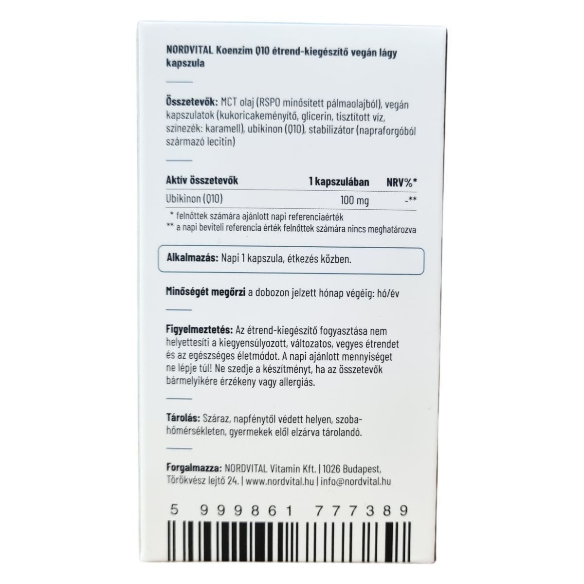 A NORDVITAL Koenzim Q10 étrend-kiegészítő 100 mg ubikinont (Q10) tartalmaz, amely RSPO minősített, fenntartható gazdaságból származó MCT olajban oldott és napraforgóból származó lecitin hozzáadásával készült. A készítmény vegán lágy kapszulákkal érhető el, melyek kukoricakeményítőből, glicerinből, tisztított vízből és karamellszínezékből állnak. A termék GMP minősített gyártóüzemben készül, laboratóriumban bevizsgált, és glutén-, laktóz-, allergén- és GMO-mentes. Nettó tömege 28,2 g, 60 kapszula található egy dobozban, amely 60 napi adagnak felel meg. A minőség megőrzése érdekében a kapszulákat száraz, napfénytől védett, gyermekektől elzárt helyen szobahőmérsékleten célszerű tárolni.