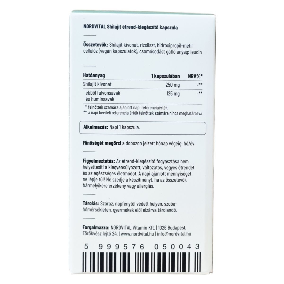 Shilajit kivonat, rizsliszt, hidroxipropil-metil-cellulóz (vegán kapszulák), csomósodást gátló anyag: leucin