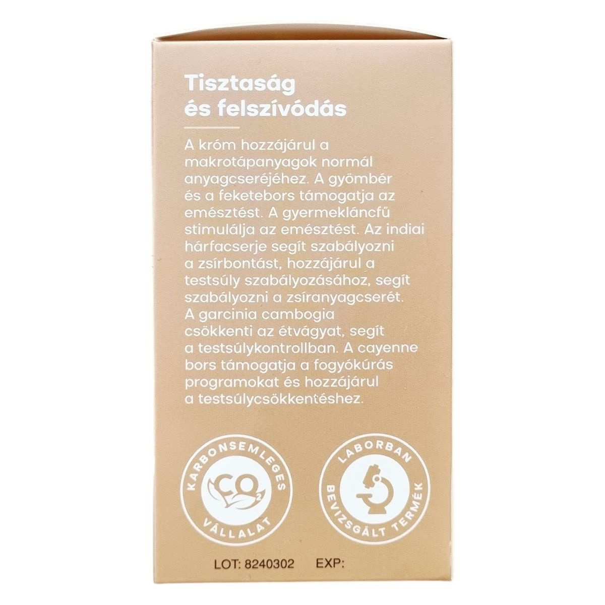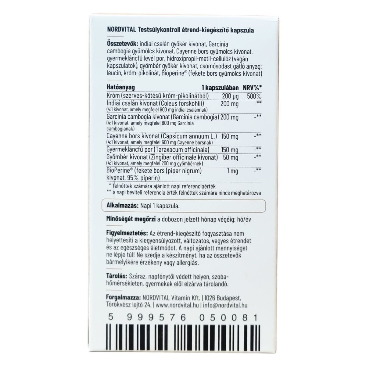 A NORDVITAL Testsúlykontroll egy laborban bevizsgált, karbonsemleges vállalat terméke, mely GMP (Good Manufacturing Practice) minősített gyártóüzemben készül különösen magas tisztaságú összetevőkből. A készítmény krómot tartalmaz, amely hozzájárulhat a makrotápanyagok normál anyagcseréjéhez, továbbá olyan növényi kivonatokat, amelyek támogatják az emésztést és a zsíranyagcserét: a gyermekláncfű és a gyömbér stimulálhatja az emésztést, az indiai hárfacserje segítheti a zsírbontást és a testsúly szabályozását, a garcinia cambogia csökkentheti az étvágyat, a cayenne bors pedig támogathatja a fogyókúrás programokat és a testsúlycsökkentést. A termék vegán, laktóz-, allergén-, glutén- és GMO-mentes, így sokféle étrendi igényhez illeszthető.