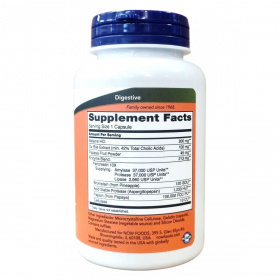 A NOW Super Enzymes enzimek komplex keverékét tartalmazza, amely bromelaint, ox epe kivonatot, pancreatint és papaint foglal magában. Ezek az enzimek segíthetik a zsírok, szénhidrátok és fehérjék optimális lebontását az emésztés során. A készítmény nem tartalmaz allergéneket, például búzát, glutént vagy tejtermékeket, és GMP tanúsítvánnyal rendelkező üzemben készül, amely megfelel a minőségi előírásoknak. Az összetevők globálisan beszerzettek, és az USA-ban gyártják, majd minőségileg tesztelik. A kapszula mérete 7, és a palack PET anyaga 100%-ban újrahasznosított műanyagból készül. A termék természetes színeltéréseket mutathat. Az állításokat az FDA nem értékelte, a termék nem alkalmas betegségek diagnosztizálására, kezelésére vagy megelőzésére.
