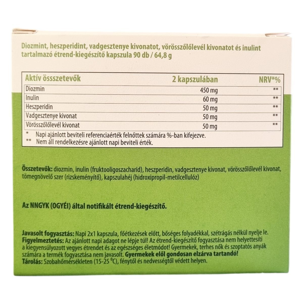 diozmin, inulin (fruktooligoszacharid), heszperidin, vadgesztenye kivonat, vörösszőlőlevél kivonat, tömegnövelő szer (rizskeményítő), kapszulahéj (hidroxipropil-metilcellulóz)