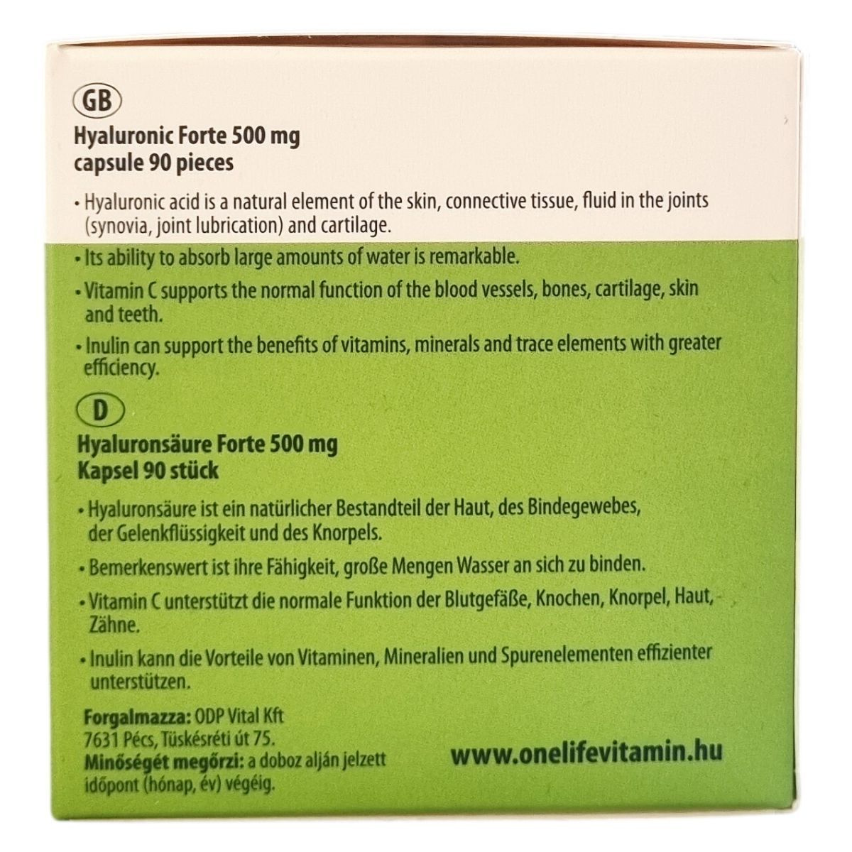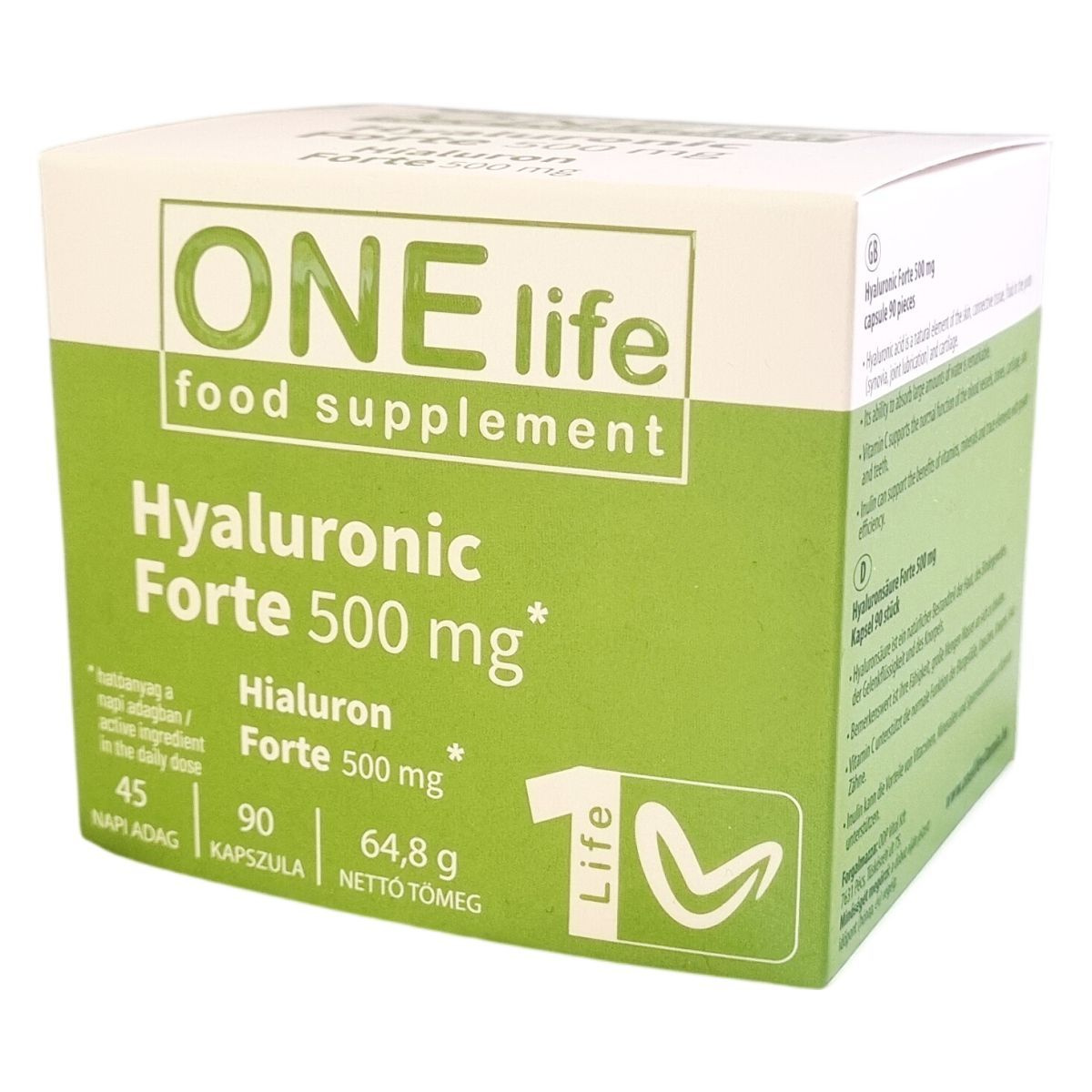 A Hyaluronic Forte 500 mg kapszula hialuronsavat, C-vitamint és inulint tartalmaz. A hialuronsav a bőr, kötőszövet, ízületi folyadék és porcszövet természetes alkotórésze, amely kiemelkedő képességgel rendelkezik nagy mennyiségű víz megkötésére. A C-vitamin hozzájárulhat a megfelelő kollagénképződéshez, támogatva ezzel a bőr és a porcok normál állapotát és működését, emellett az immunrendszer és a csontozat normál működésében is szerepet játszhat. Az inulin elősegítheti a vitaminok, ásványi anyagok és nyomelemek hatékonyabb hasznosulását. A termék kapszulában kerül forgalomba, és fogyasztása során fontos a megfelelő folyadékbevitel. Az érintettek kizárólag a csomagoláson jelzett mennyiséget fogyasszák, továbbá a termék nem helyettesíti a változatos étrendet és az egészséges életmódot.