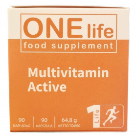 A ONE life Multivitamin Active kapszula olyan vitaminokat, ásványi anyagokat, nyomelemeket, koenzim Q10-et, valamint ashwagandha- és aranygyökér kivonatokat tartalmazó étrend-kiegészítő, amely hozzájárulhat az immunrendszer normál működéséhez, a mentális teljesítmény és szellemi frissesség fenntartásához, továbbá támogatja a szív-, a csont-, az ízületi- és az immunrendszer egészségét. A termék hatóanyagai között szerepelnek az A-, B-, C-, D-, E- és K-vitaminok, a cink, vas, réz, szelén, jód, magnézium és króm, amelyek fontos szerepet játszanak a szervezet normál anyagcsere-folyamataiban és a sejtek oxidatív stressz elleni védelmében. Az adaptogén növényi összetevők, mint a goldenseal és ashwagandha, segíthetik a szervezet védekezőképességét a stressz, a sejtkárosodás és a mentális fáradtság ellen. A kapszulák napi egyszeri bevétele javasolt, a készítmény szedése mellett ajánlott a változatos és kiegyensúlyozott étrend, valamint az egészséges életmód fenntartása.