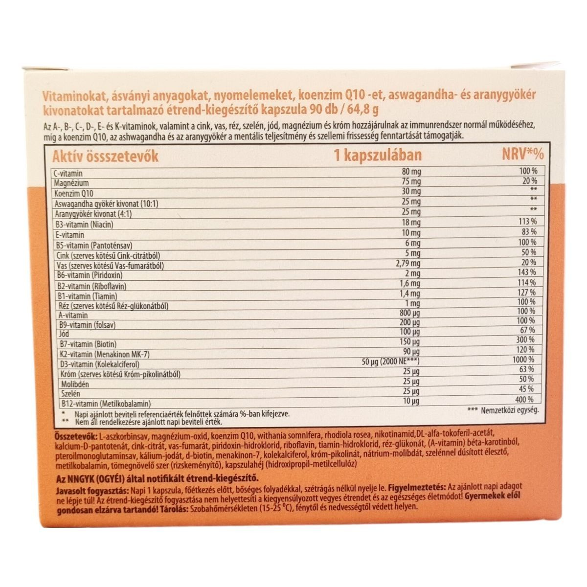 L-aszkorbinsav, magnézium-oxid, koenzim Q10, withania somnifera, rhodiola rosea, nikotinamid, DL-alfa-tokoferil-acetát, kalcium-D-pantotén, cink-citrát, vas-fumarát, piridoxin-hidroklorid, riboflavin, tiamin-hidroklorid, réz-glükonát, (A-vitamin) béta-karotinból, pteroilmonoglutaminsav, kálium-jodát, d-biotin, menakinon-7, kolekalciferol, króm-pikolinát, nátrium-molibdát, szelénnel dúsított élesztő, metilkobalamin, tömegnövelő szer (rizskeményítő), kapszulahéj (hidroxipropil-metilcellulóz)