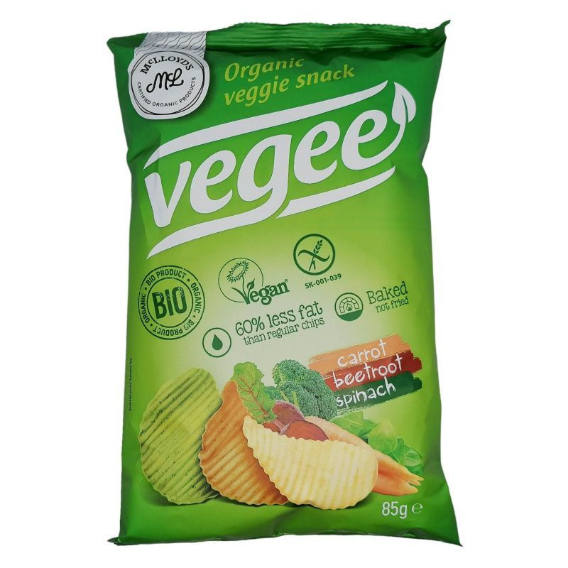 Organikus burgonya snack répa, cékla és brokkoli ízesítéssel, a hagyományos burgonya chipseknél 60%-kal kevesebb zsírtartalommal.
