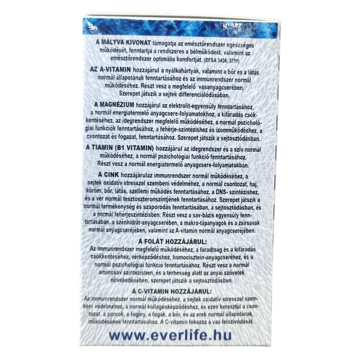 Magnézium-hidroxid, tömegnövelő szer (mikrokristályos cellulóz), Citrus sinensis kivonat, mályva kivonat, hidroxipropil-metil-cellulóz, L-aszkorbinsav, cink-szulfát-monohidrát, zsírsavak, tiamin-mononitrát, gellángumi, retinil-acetát, folsav