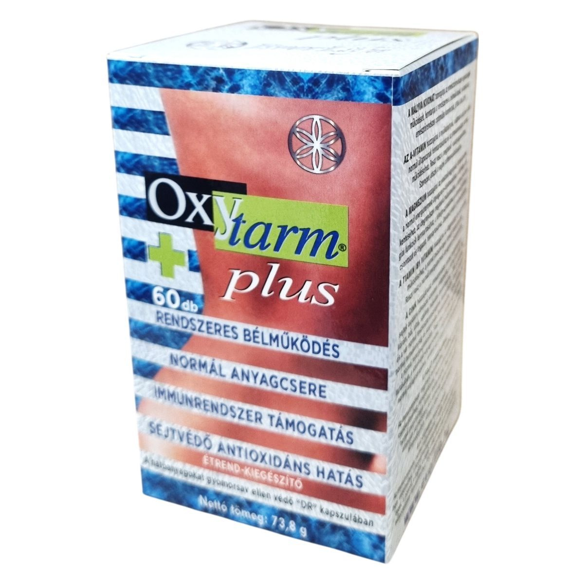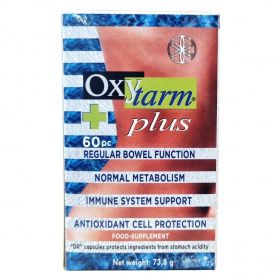 Az OxYtarm® plus kapszula hatóanyagai között szerepel a mályva kivonat, amely hozzájárulhat az emésztőrendszer egészséges működéséhez és a bélműködés fenntartásához. Az A-vitamin részt vehet a nyálkahártyák, bőr és látás normál állapotának fenntartásában, valamint az immunrendszer megfelelő működésében. Magnézium támogatja az elektrolit-egyensúlyt, energiatermelő anyagcsere-folyamatokat, idegrendszer működését és az izomműködést. A tiamin (B1-vitamin) hozzájárulhat az idegrendszer és a szív normál működéséhez és az energiatermelő folyamatokhoz. A cink részt vehet az immunrendszer támogatásában, a sejtek oxidatív stresszel szembeni védelmében, valamint a csontozat, bőr és látás fenntartásában. A folát hozzájárulhat az immunrendszer működéséhez, a fáradtság csökkentéséhez és a vérképződéshez, továbbá szerepet játszhat a terhesség alatt az anyai szövetek növekedésében. A C-vitamin támogatja az immunrendszert, sejtvédelemben és a kollagénképződés folyamatában vesz részt, amely fontos a csontrendszer, porcok, fogak és bőr egészségéhez, valamint elősegíti a vas felszívódását. A hatóanyagokat gyomorsav ellen védő "DR" kapszulában találhatók meg. A nettó tömeg 73,8 g.