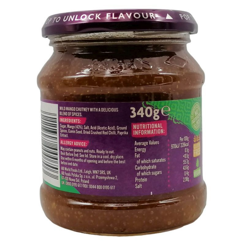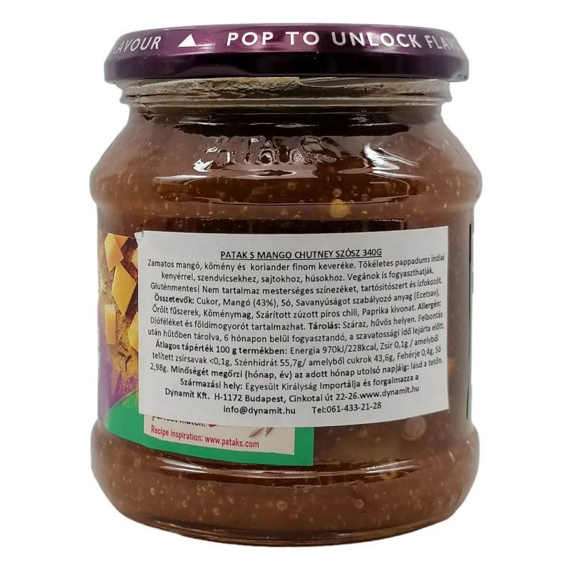 Tökéletes pappadums indiai kenyérrel, szendvicsekhez, sajtokhoz, húsokhoz. Gluténmentes! Nem tartalmaz mesterséges színezéket, tartósítószert és ízfokozót. Vegetáriánusok is fogyaszthatják! Összetevők: Cukor, Mangó (43%), Só, Savanyúságot szabályozó anyag (Ecetsav), Őrölt fűszerek, Köménymag, Szárított zúzott piros chili, Paprika kivonat. Allergén: Dióféléket és földimogyorót tartalmazhat. Tárolás: Száraz, hűvös helyen. Felbontás után hűtőben tárolva, 6 hónapon belül fogyasztandó, a szavatossági idő lejárta előtt.