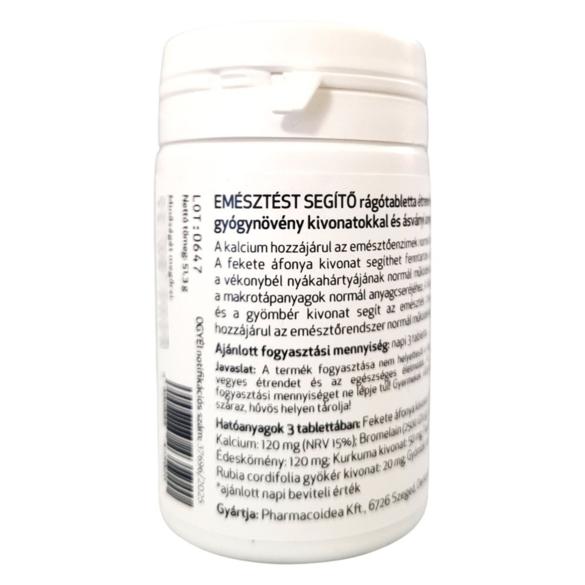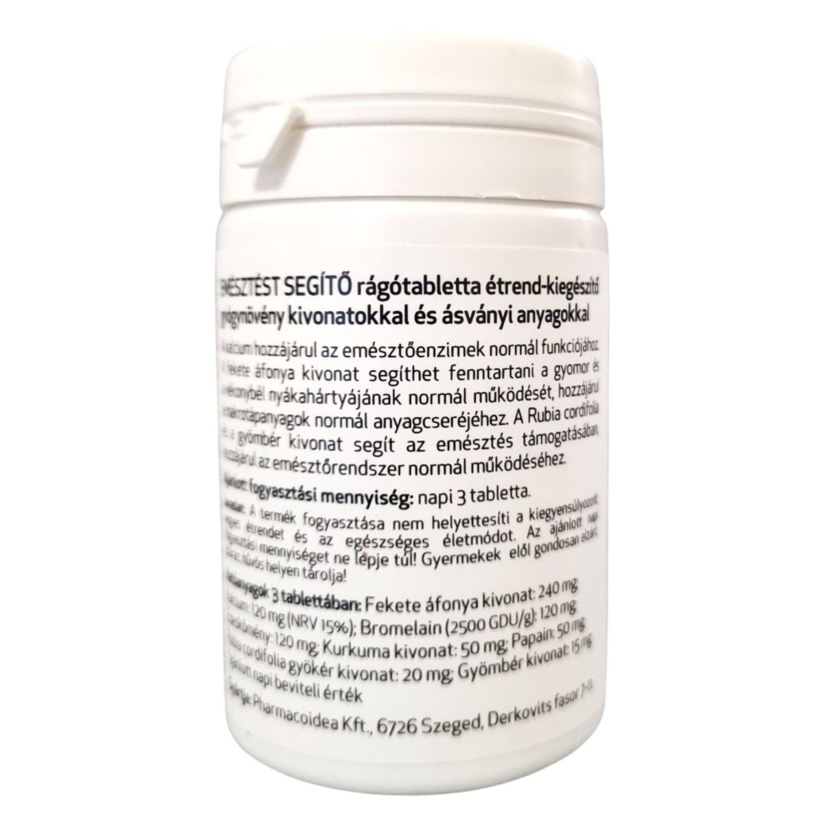 Az Emésztést Segítő rágótabletta egy étrend-kiegészítő, amely gyógynövény kivonatokkal és ásványi anyagokkal készülhet. A termék összetevői, mint a fekete áfonya kivonat, a Rubia cordifolia és a gyömbér kivonat, hozzájárulhatnak az emésztőrendszer normál működéséhez. A kalcium támogathatja az emésztőenzimek normál funkcióját, míg a fekete áfonya kivonat segíthet fenntartani a gyomor és a vékonybél nyákahártyájának normál működését. A termék napi ajánlott fogyasztási mennyisége 3 tabletta, és fontos, hogy az ajánlott napi beviteli értéket ne lépje túl. A terméket száraz, hűvös helyen kell tárolni, és gyermekek elől gondosan elzárva tartani.
