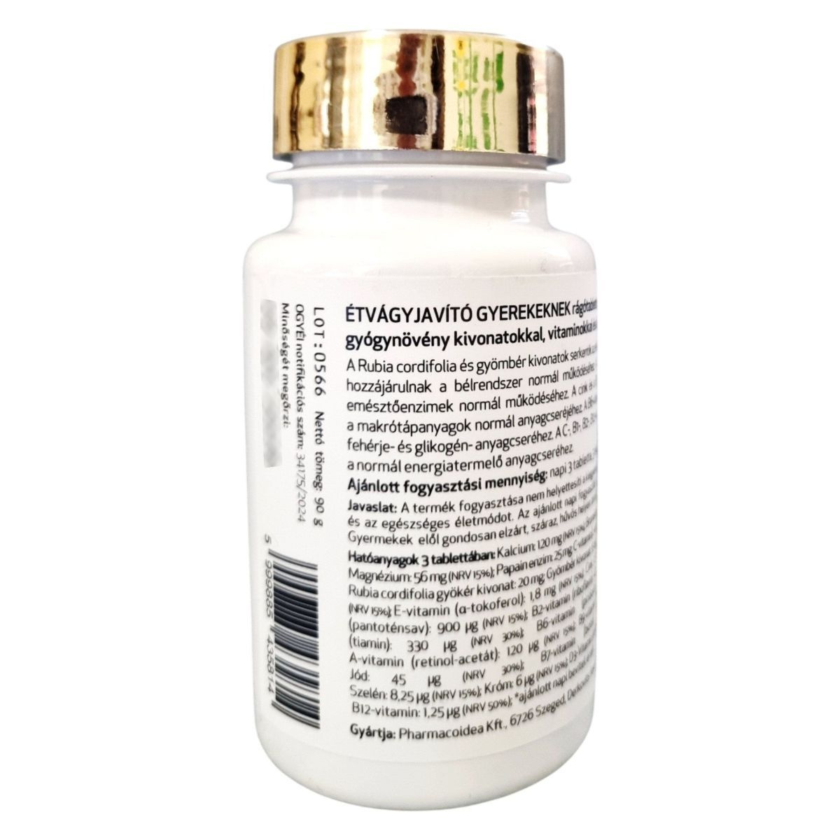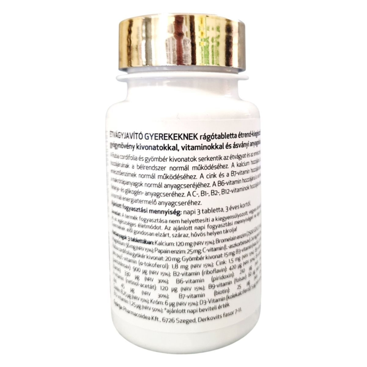 Az Étvágyjavító Gyerekeknek rágótabletta célja, hogy támogassa a gyermekek étvágyát és emésztését. A termék különféle vitaminokat és ásványi anyagokat tartalmaz, amelyek hozzájárulhatnak a bélrendszer normál működéséhez és a makrotápanyagok anyagcseréjéhez. A termék 180 tablettát tartalmaz, és a Pharmacoidea Kft. gyártja. A Rubia cordifolia és gyömbér kivonatok mellett a tablettákban található kalcium, cink, B-vitaminok és más fontos tápanyagok is. A termék használata nem helyettesíti a kiegyensúlyozott étrendet és az egészséges életmódot.