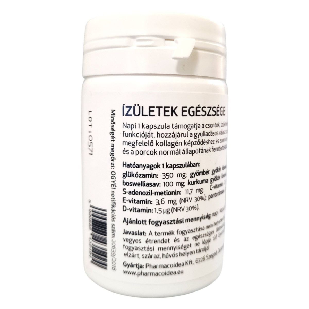A Pharmacoidea Ízületek Egészsége kapszula olyan hatóanyagokat tartalmaz, mint a glükózamin, boswelliasav, S-adenozil-metionin, gyömbér és kurkuma kivonatok, valamint C, E, B5 és D3 vitaminok. Ezek az összetevők hozzájárulhatnak a csontok, ízületek és izmok normál funkciójának fenntartásához, a gyulladásos válasz szabályozásához, valamint a megfelelő kollagén képződéshez. A termék napi 1 kapszula fogyasztásával támogathatja a szervezet ezen funkcióit. A terméket a Pharmacoidea Kft. gyártja, és OGYÉI notifikációs számmal rendelkezik.