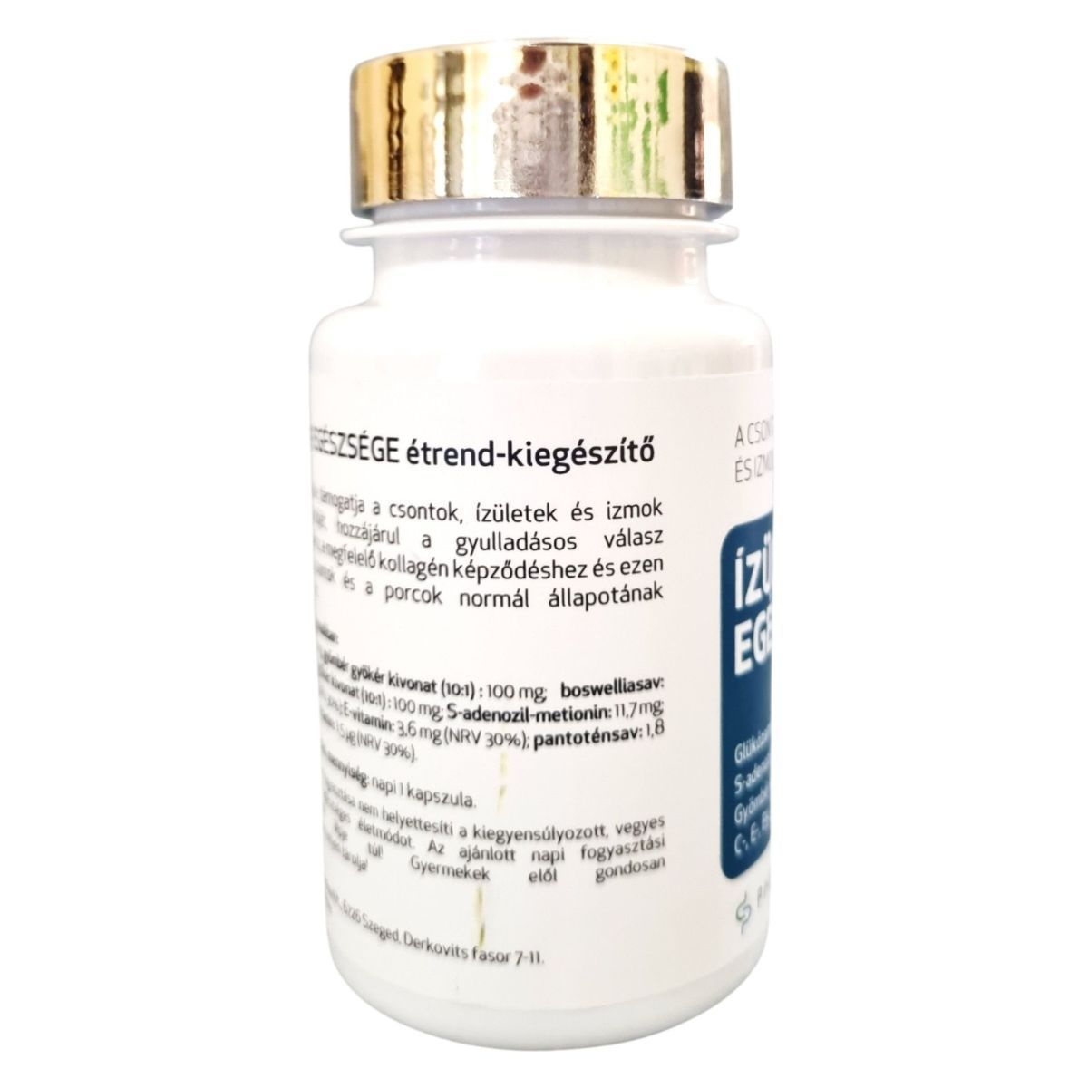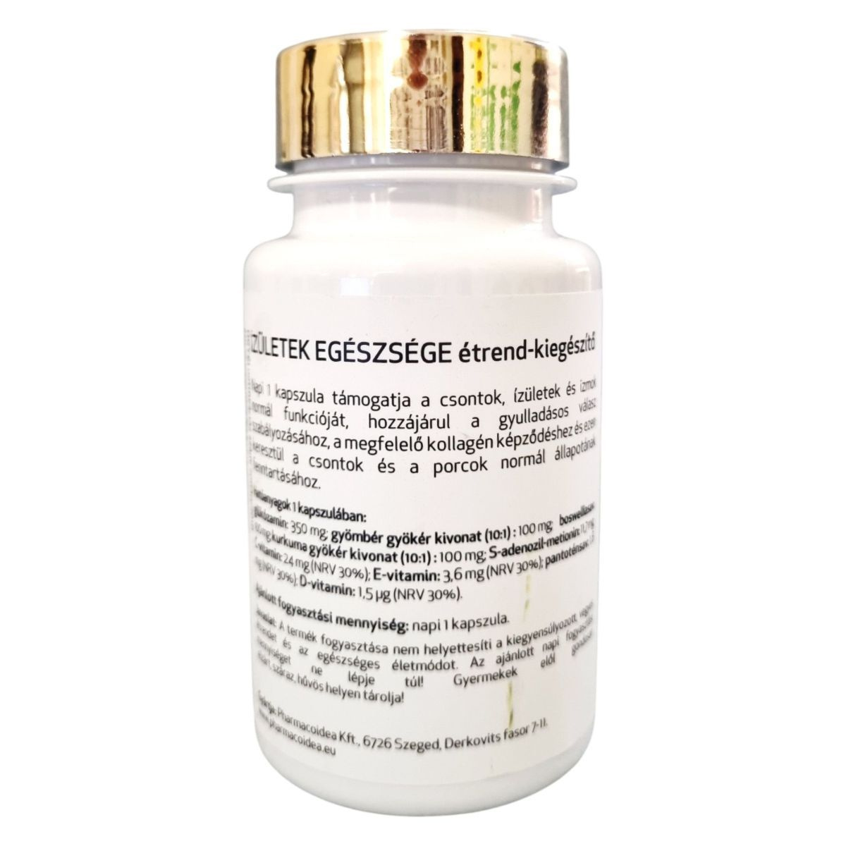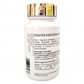 Az Ízületek Egészsége étrend-kiegészítő célja, hogy támogassa a csontok, ízületek és izmok normál funkcióját. A termék glükózamint, boswelliasavat, S-adenozil-metionint, gyömbér és kurkuma kivonatokat, valamint C-, E-, B5- és D3-vitaminokat tartalmaz. Ezek az összetevők hozzájárulhatnak a gyulladásos válasz szabályozásához, a megfelelő kollagén képződéshez, és ezen keresztül a csontok és a porcok normál állapotának fenntartásához. A terméket a Pharmacoidea Kft. gyártja Szegeden.
