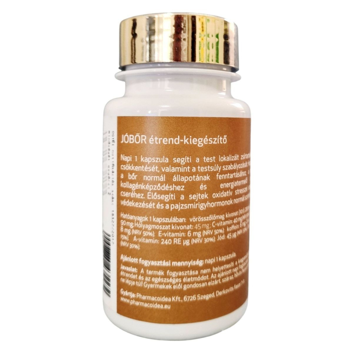 A JÓBŐR étrend-kiegészítő kapszula olyan hatóanyagokat tartalmaz, mint a vörösszőlőmag kivonat, L-karnitin, hólyagmoszat kivonat, valamint különböző vitaminok és ásványi anyagok. Ezek az összetevők hozzájárulhatnak a test zsírtartalékainak csökkentéséhez, a testsúly szabályozásához, a bőr normál állapotának fenntartásához, a normál kollagénképződéshez, az energiatermelő anyagcseréhez, a sejtek oxidatív stresszel szembeni védekezéséhez és a pajzsmirigyhormonok normál szintéziséhez. A termék fogyasztása nem helyettesíti a kiegyensúlyozott étrendet és az egészséges életmódot.