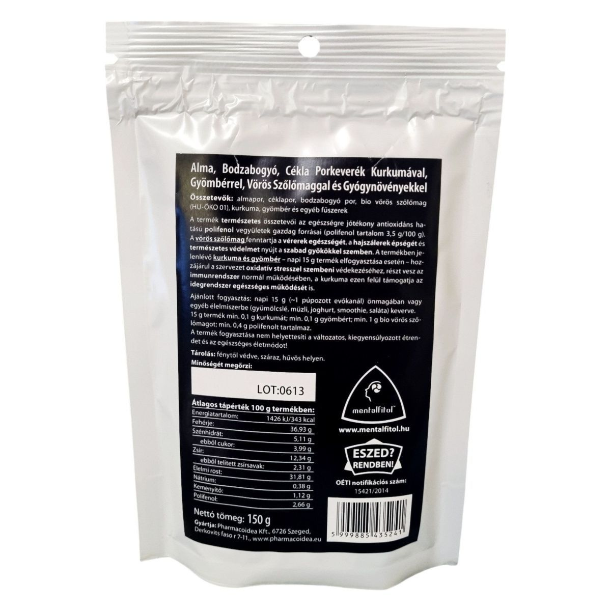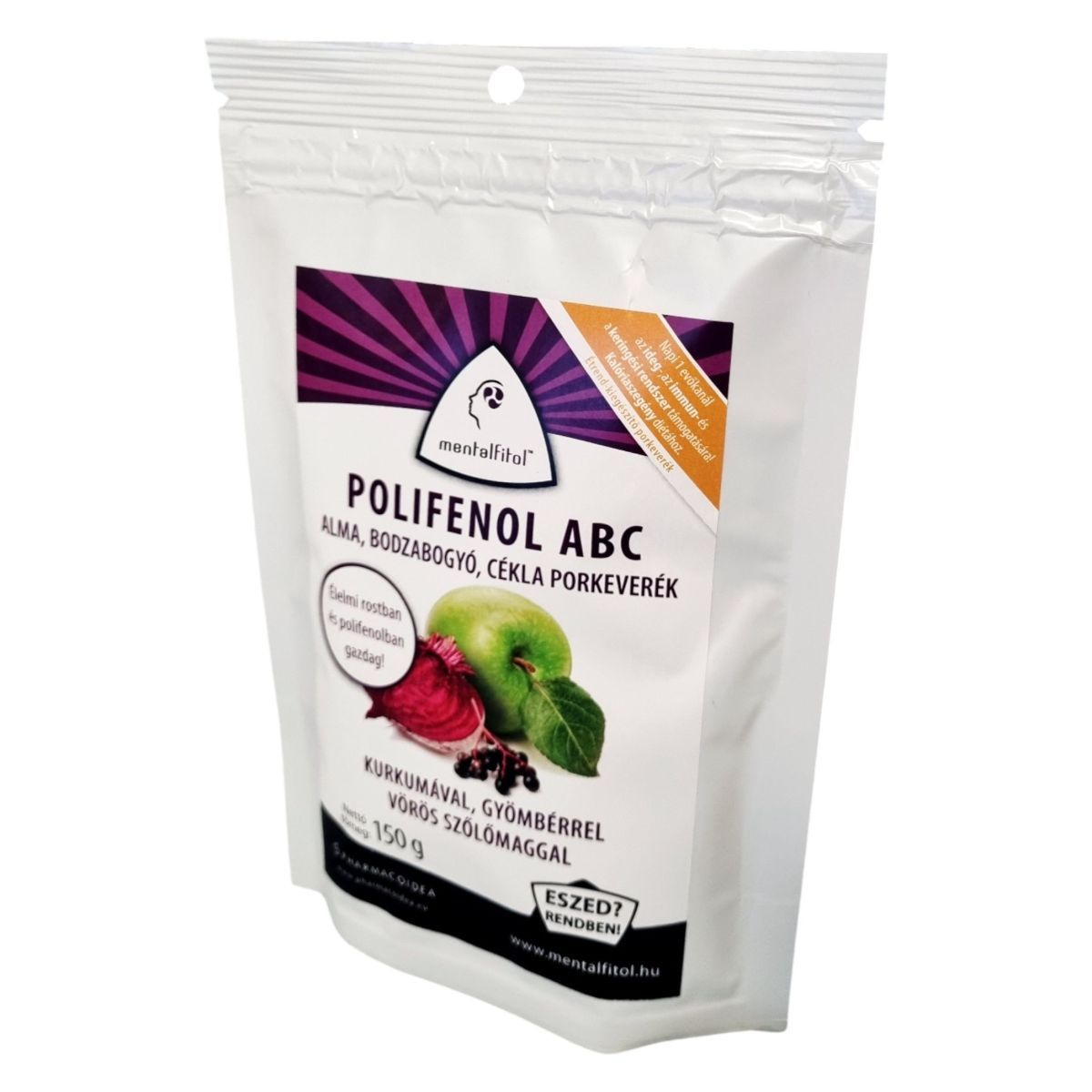 A mentalfitol™ POLIFENOL ABC alma, bodzabogyó, cékla porkeverék egy bio minősítésű étrend-kiegészítő, amely gazdag élelmi rostokban és polifenolokban. A termék természetes összetevői, mint az almapor, céklapor, bodzabogyó por, bio vörös szőlőmag, kurkuma és gyömbér, antioxidáns hatású polifenol vegyületek forrásai lehetnek. A vörös szőlőmag hozzájárulhat a vérerek és hajszálerek egészségének fenntartásához, míg a kurkuma és gyömbér támogathatja az immunrendszer normál működését és az oxidatív stresszel szembeni védekezést. A termék napi ajánlott mennyisége 15 g, amelyet önmagában vagy különböző élelmiszerekbe keverve fogyaszthatunk. A termék fogyasztása nem helyettesíti a változatos étrendet és az egészséges életmódot.