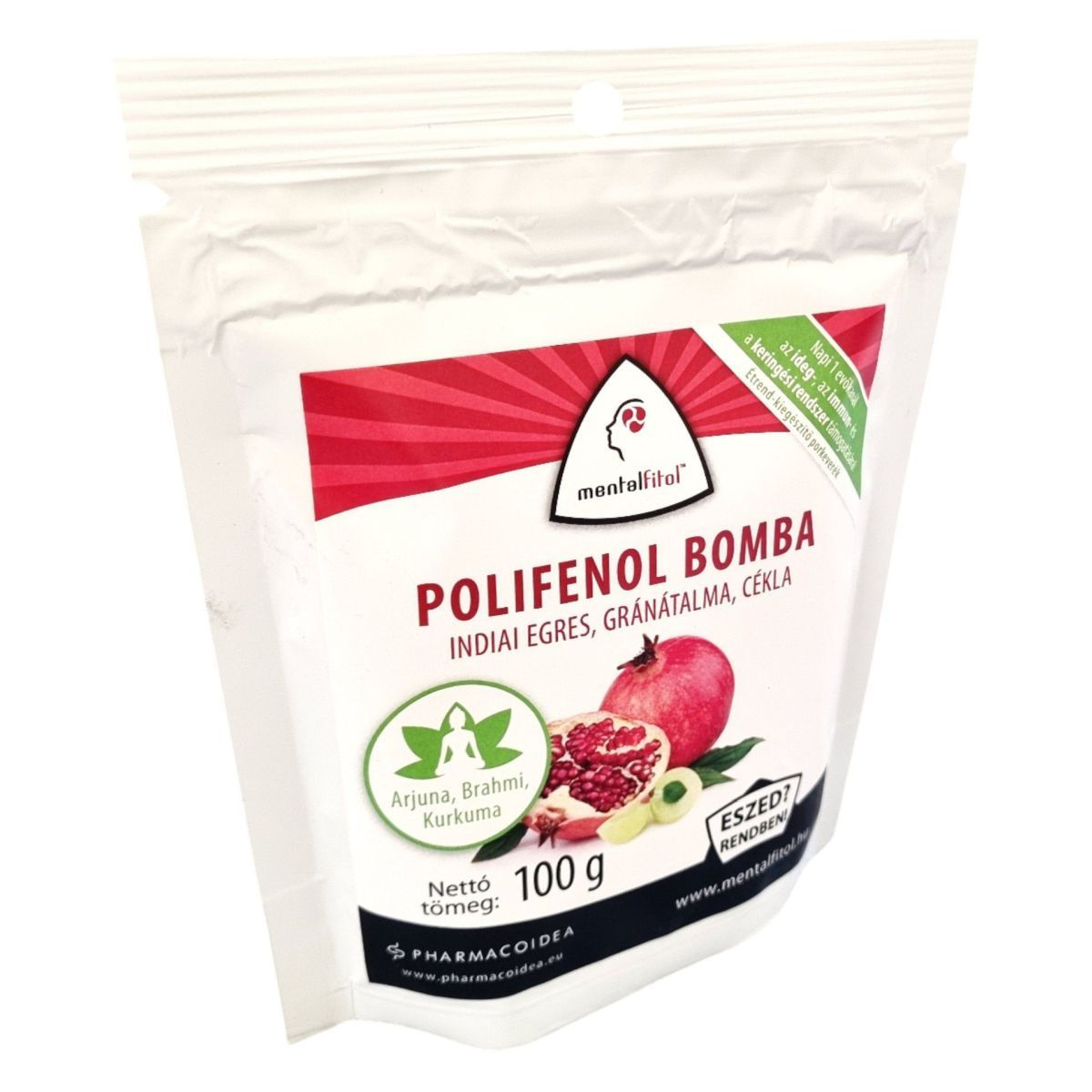 A mentalfitol™ POLIFENOL BOMBA egy 100 g-os étrend-kiegészítő porkeverék, amely indiai egres, gránátalma és cékla alapú összetevőkkel készült. Az ayurvédikus orvoslásban is használt indiai egres az anyagcsere, az immun-, az emésztő- és a keringési rendszer támogatására szolgálhat. A gránátalma magas antioxidáns tartalmával, míg a cékla flavonoid- és rosttartalmával járulhat hozzá az egészség megőrzéséhez. A termék tartalmaz továbbá arjunát, kurkumát, gyömbért és brahmit, amelyek az ideg- és a szív- és érrendszer egészségét támogathatják. A termék napi ajánlott mennyisége 10 g, amelyet önmagában vagy élelmiszerbe keverve fogyaszthatunk.