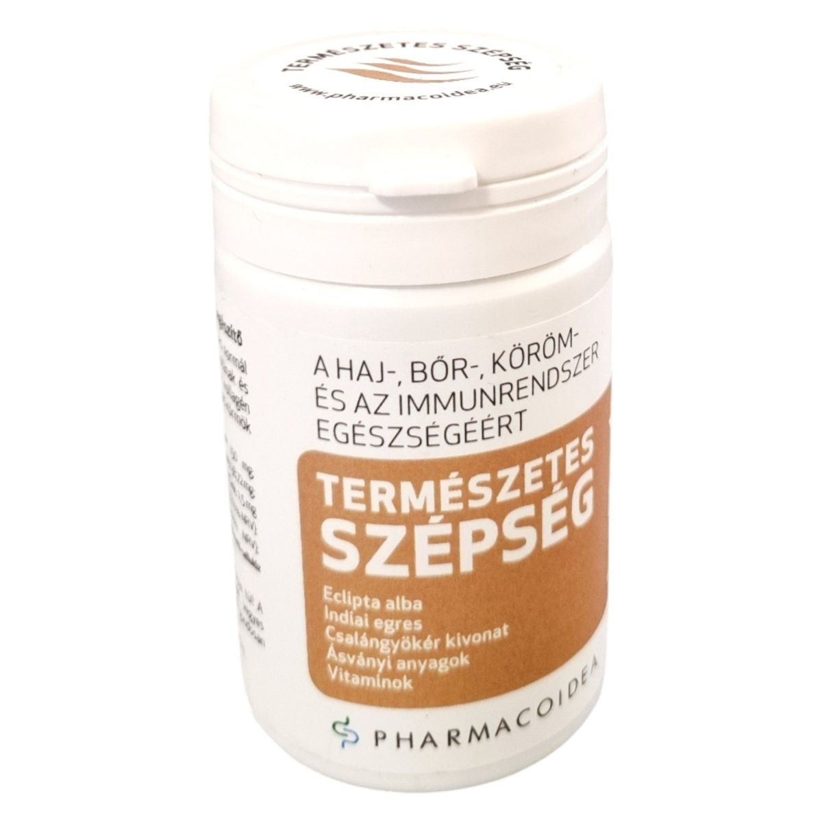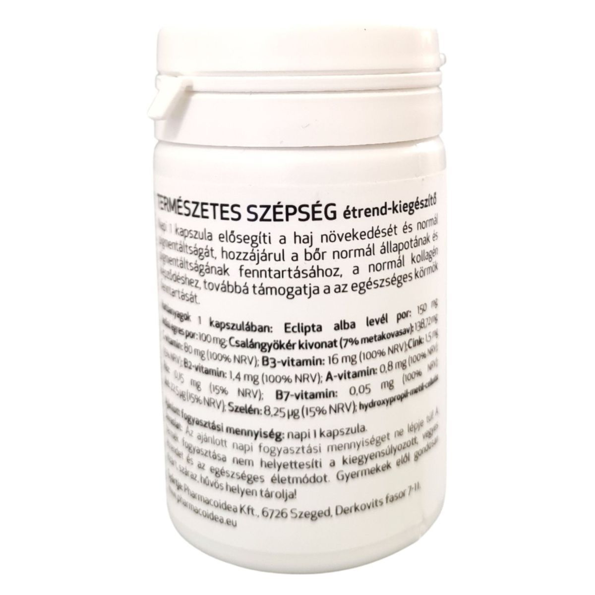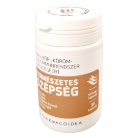 A TERMÉSZETES SZÉPSÉG étrend-kiegészítő napi 1 kapszula formájában segíthet a haj növekedésének és normál pigmentáltságának elősegítésében, valamint a bőr normál állapotának és pigmentáltságának fenntartásában. Továbbá támogathatja a normál kollagén képződést és az egészséges körmök fenntartását. A termék hatóanyagai között megtalálható az Eclipta alba levél por, indiai egres por, csalángyökér kivonat, valamint különböző vitaminok és ásványi anyagok, mint például a C-vitamin, B3-vitamin, cink, B2-vitamin, A-vitamin, réz, B7-vitamin, jód és szelén. A terméket a Pharmacoidea Kft. gyártja Szegeden.