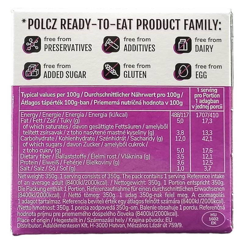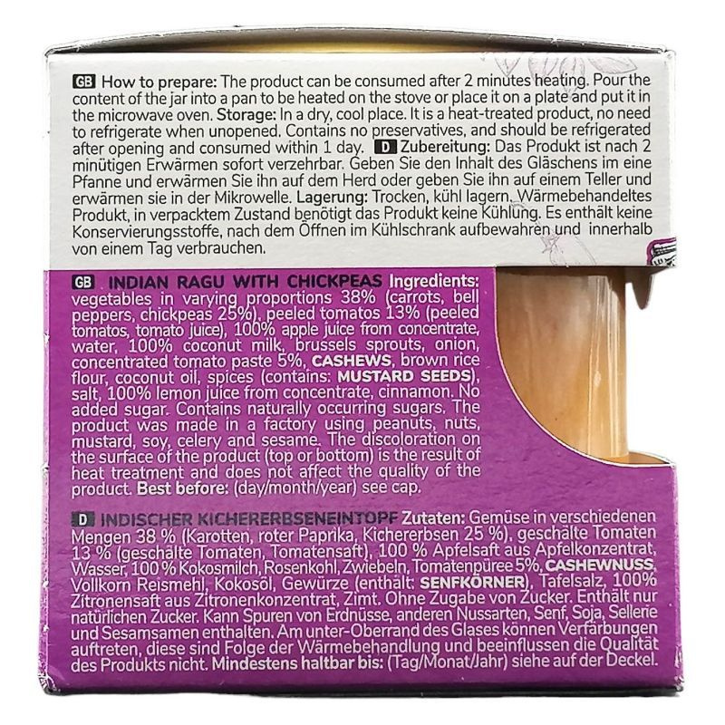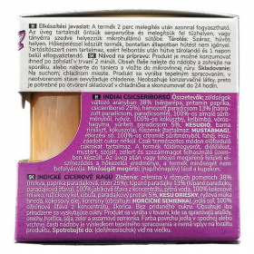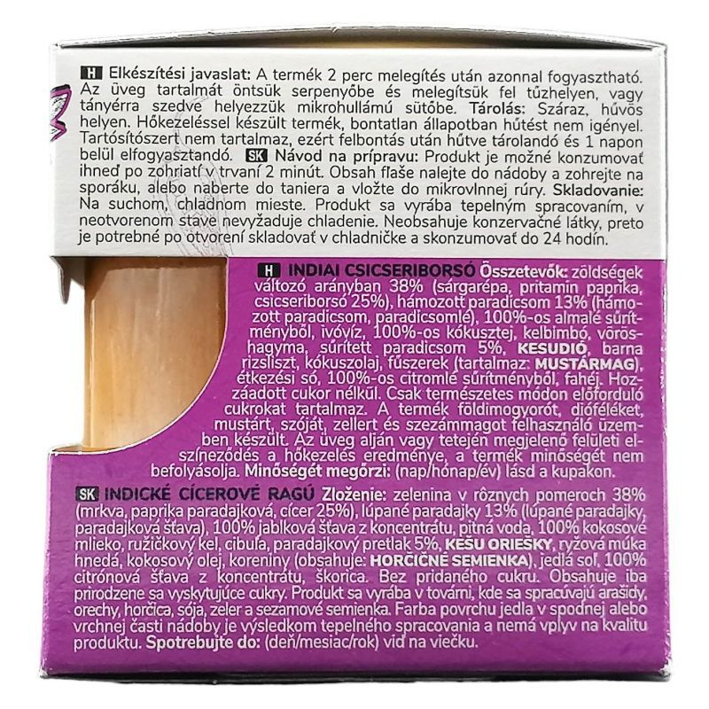 Az energiában gazdag csicseriborsót pritamin paprikával és sárgarépával dobtuk fel.Tálald 2 főre jázmin rizzsel vagy naan kenyérrel és egy kis tejföllel. Ha húst is fogyasztasz, akkor próbáld ki pirított csirkehús kockákkal is. Összetevők: zöldségek változó arányban 38% (sárgarépa, pritamin paprika, csicseriborsó 25%), hámozott paradicsom 13% (hámozott paradicsom, paradicsomlé), 100%-os almalé sűrítményből, ivóvíz, 100%-os kókusztej, kelbimbó, vöröshagyma, sűrített paradicsom 5%, kesudió, barna rizsliszt, kókuszolaj, fűszerek (tartalmaz: mustármag), étkezési só, 100%-os citromlé sűrítményből, fahéj.
