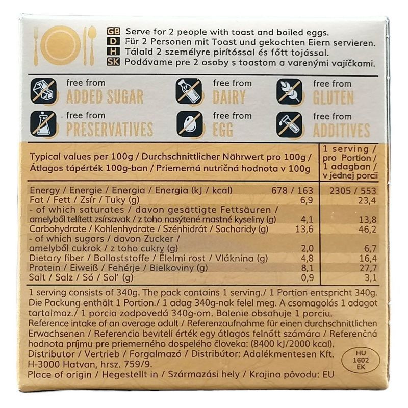 Hozzáadott cukor-, tej-, glutén, tojás, tartósítószer- és adalékanyag-mentes.