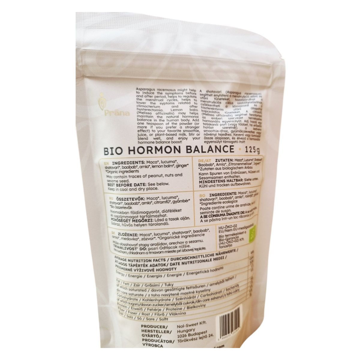 A Prāna BIO HORMON BALANCE egy 125g-os kiszerelésű étrend-kiegészítő, amely organikus szuperélelmiszerekből készült. A termék célja, hogy természetes módon támogassa a hormonális egyensúlyt és a mindennapi harmóniát. A termék bio, vegán és gluténmentes, így széles körben alkalmazható különböző étrendi igények esetén. Az összetevők között megtalálható a maca, lucuma, shatavari, baobab, amla, citromfű és gyömbér, amelyek mind organikus forrásból származnak. A termék nyomokban földimogyorót, dióféléket és szezámmagot tartalmazhat, ezért allergiások számára fontos az óvatosság. A termék energia- és tápérték adatai alapján alacsony zsírtartalmú, de jelentős mennyiségű szénhidrátot és cukrot tartalmaz. A termék minőségét száraz, hűvös helyen történő tárolással lehet megőrizni.