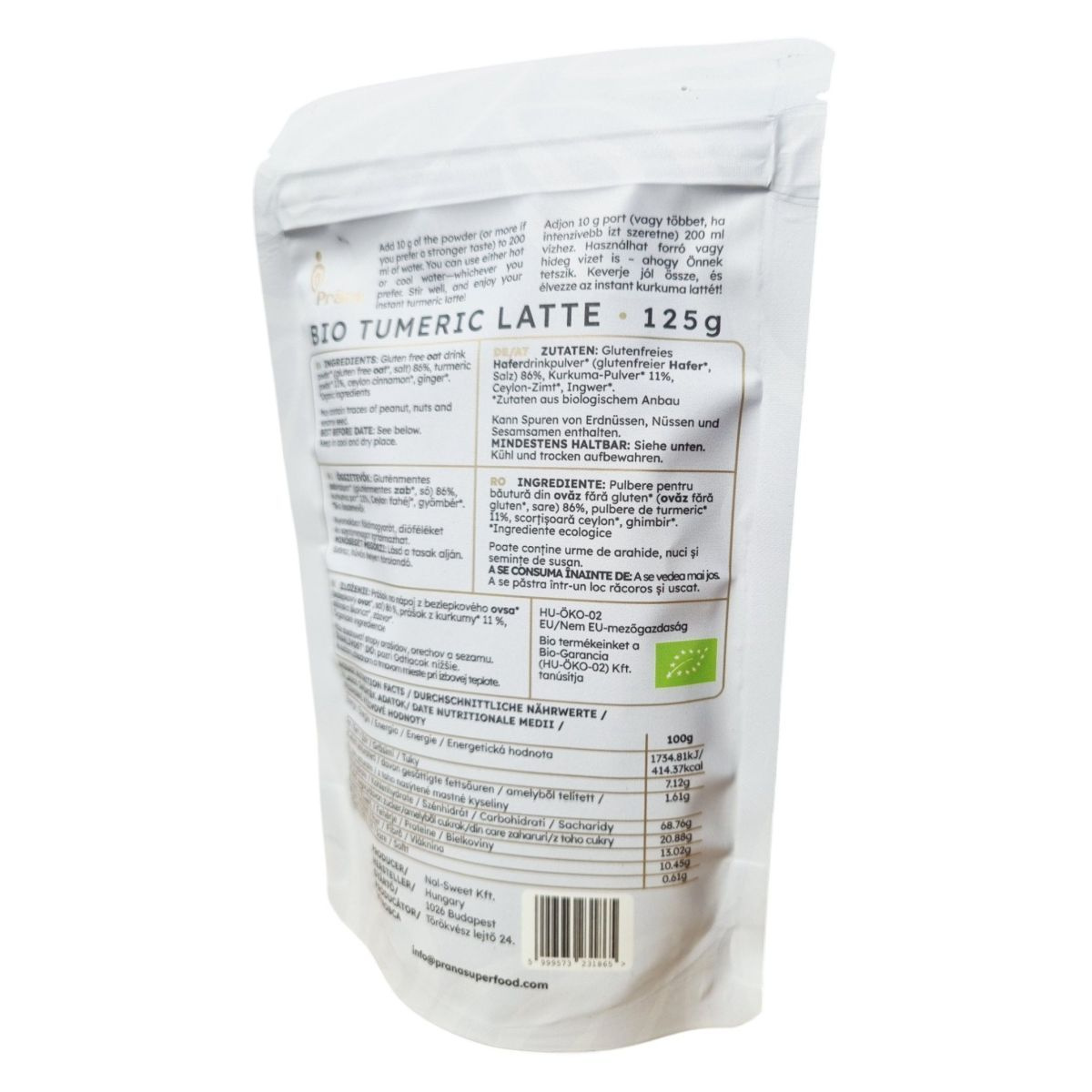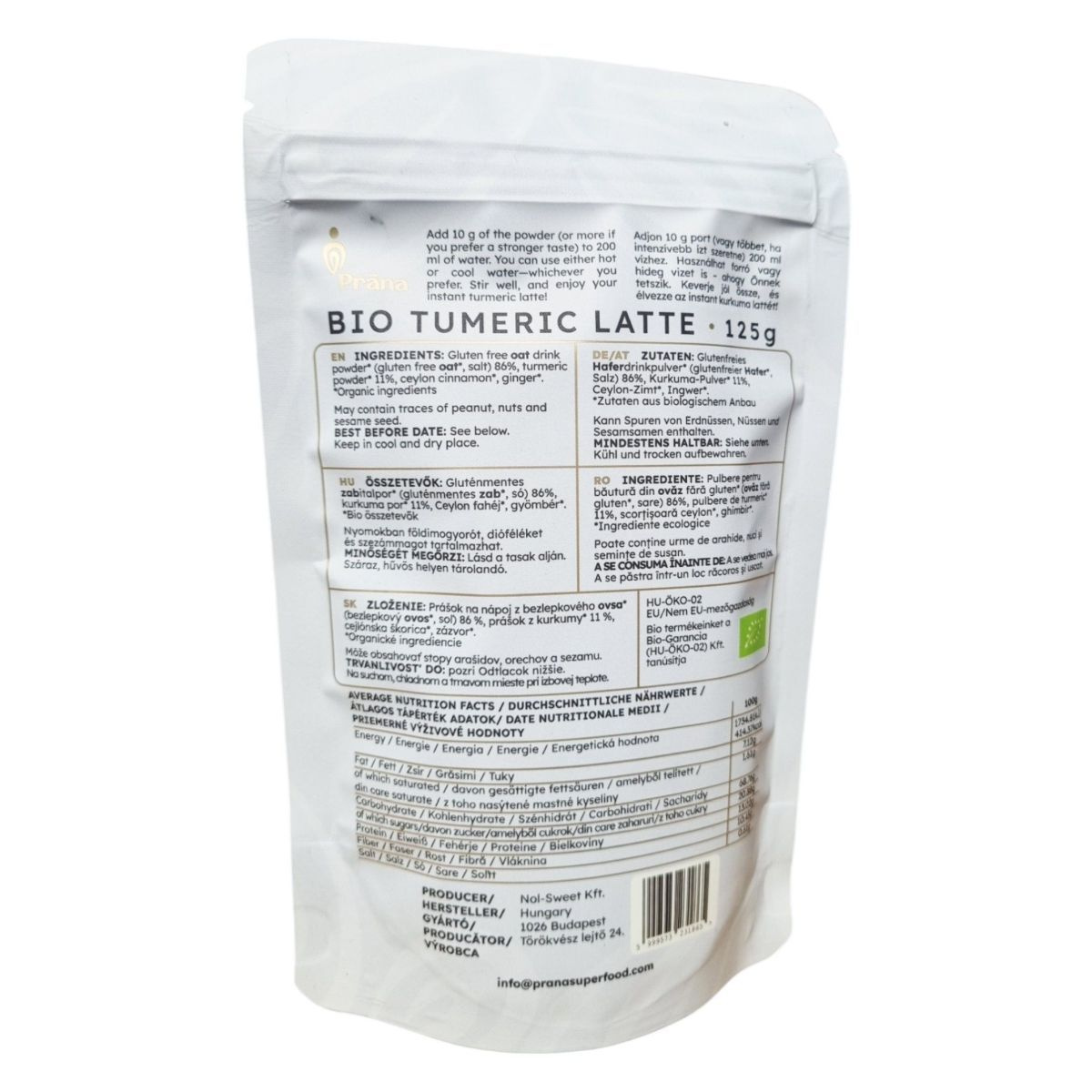 A Prána BIO TUMERIC LATTE egy 100% természetes italpor, amely kiváló minőségű kurkumából készül. A termék bio, vegán és gluténmentes, így széles körben fogyasztható. Az elkészítése egyszerű: csak adjon a porból vízhez, keverje össze, és máris élvezheti a meleg, aromás ízvilágot. Az összetevők között megtalálható a gluténmentes zabitalpor, kurkumapor, ceyloni fahéj és gyömbér, mind bio minőségben. A termék nyomokban tartalmazhat földimogyorót, dióféléket és szezámmagot. Tárolása száraz, hűvös helyen ajánlott, és a minőségét a csomagolás alján feltüntetett időpontig őrzi meg.