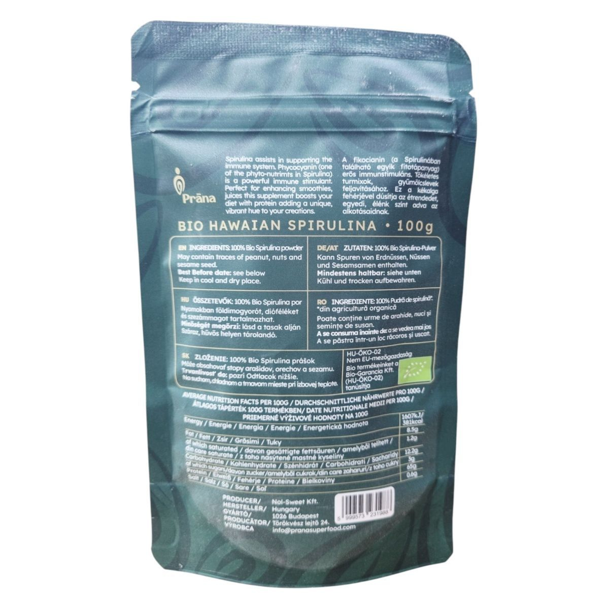 A Prāna BIO HAWAIIAN SPIRULINA spirulina por egy természetes, kék-zöld alga alapú étrend-kiegészítő, amely segíthet az immunrendszer támogatásában és a fáradtság leküzdésében. A termék 100% bio spirulina port tartalmaz, amely gazdag fehérjében és más tápanyagokban. Ideális smoothie-k és gyümölcslevek dúsítására, egyedi, élénk színt adva azoknak. A spirulina por nyomokban földimogyorót, dióféléket és szezámmagot tartalmazhat, ezért allergiások számára fontos az óvatosság. A termék gluténmentes, bio és vegán, így széles körben alkalmazható különböző étrendi igények kielégítésére.