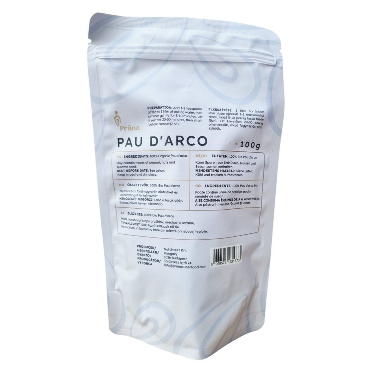 A Prāna PAU D'ARCO tea a Pau d'Arco fa belső kérgéből készül, amely különleges, fás és enyhén keserű ízvilágával tűnhet ki. A termék 100% természetes, bio és vegán, valamint gluténmentes, így széles körben fogyasztható. A tea elkészítése egyszerű: 1-2 teáskanálnyi mennyiséget ajánlott 1 liter forrásban levő vízhez adni, majd 5-10 percig lassú tűzön főzni. Ezt követően 20-30 percig pihentetjük, majd fogyasztás előtt szűrjük. A termék nyomokban földimogyorót, dióféléket és szezámmagot tartalmazhat, ezért allergiások figyeljenek erre. A tea tárolása száraz, hűvös helyen javasolt.