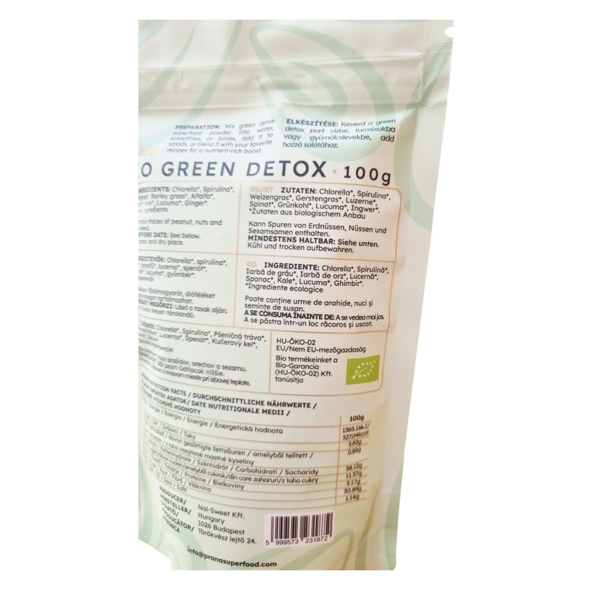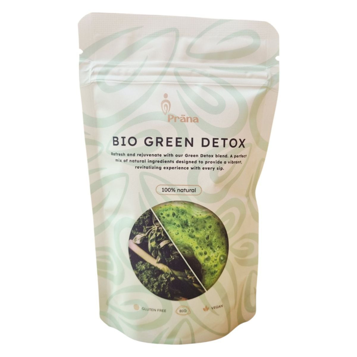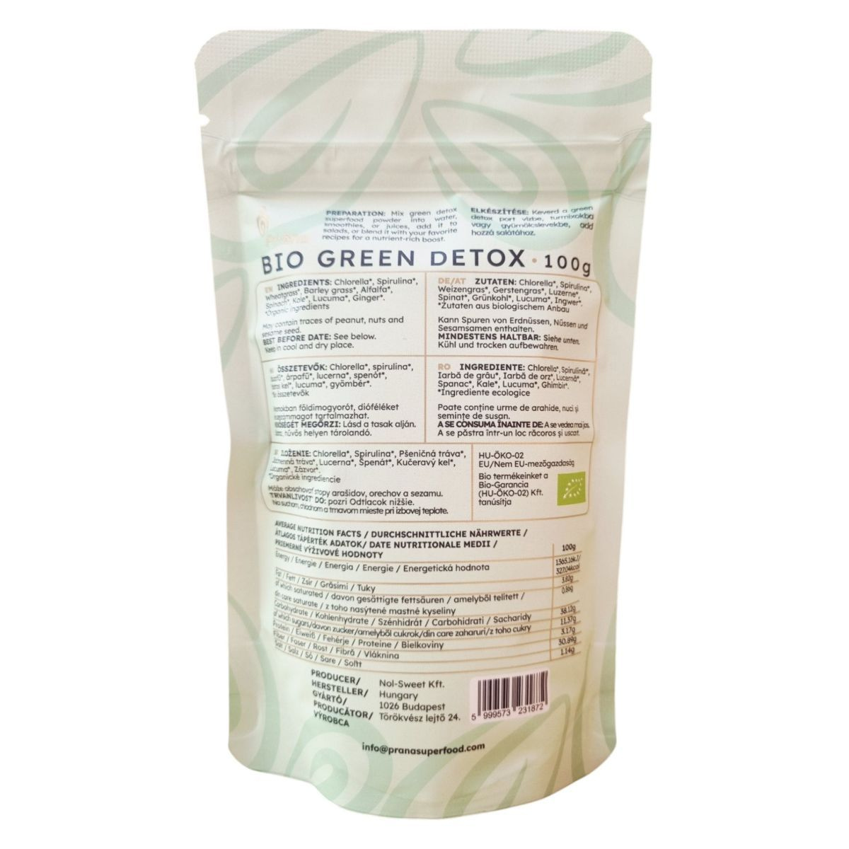 A Prāna BIO GREEN DETOX egy különleges superfood por, amely bio és vegán összetevőkből áll. A termék chlorella, spirulina, búzafű, árpafű, lucerna, spenót, kelkáposzta, lucuma és gyömbér keverékét tartalmazza, amelyek mindegyike bio minősítésű. A termék gluténmentes, így gluténérzékenyek is fogyaszthatják. A termék célja, hogy élénkítő és revitalizáló hatást nyújtson, és különféle italokba vagy ételekbe keverve fogyasztható. A termék csomagolása HU-ÖKO-02 tanúsítvánnyal rendelkezik, amely garantálja a bio minőséget. A termék nyomokban földimogyorót, dióféléket és szezámmagot tartalmazhat, ezért allergiásoknak érdemes figyelniük erre. A termék tárolása száraz és hűvös helyen ajánlott.