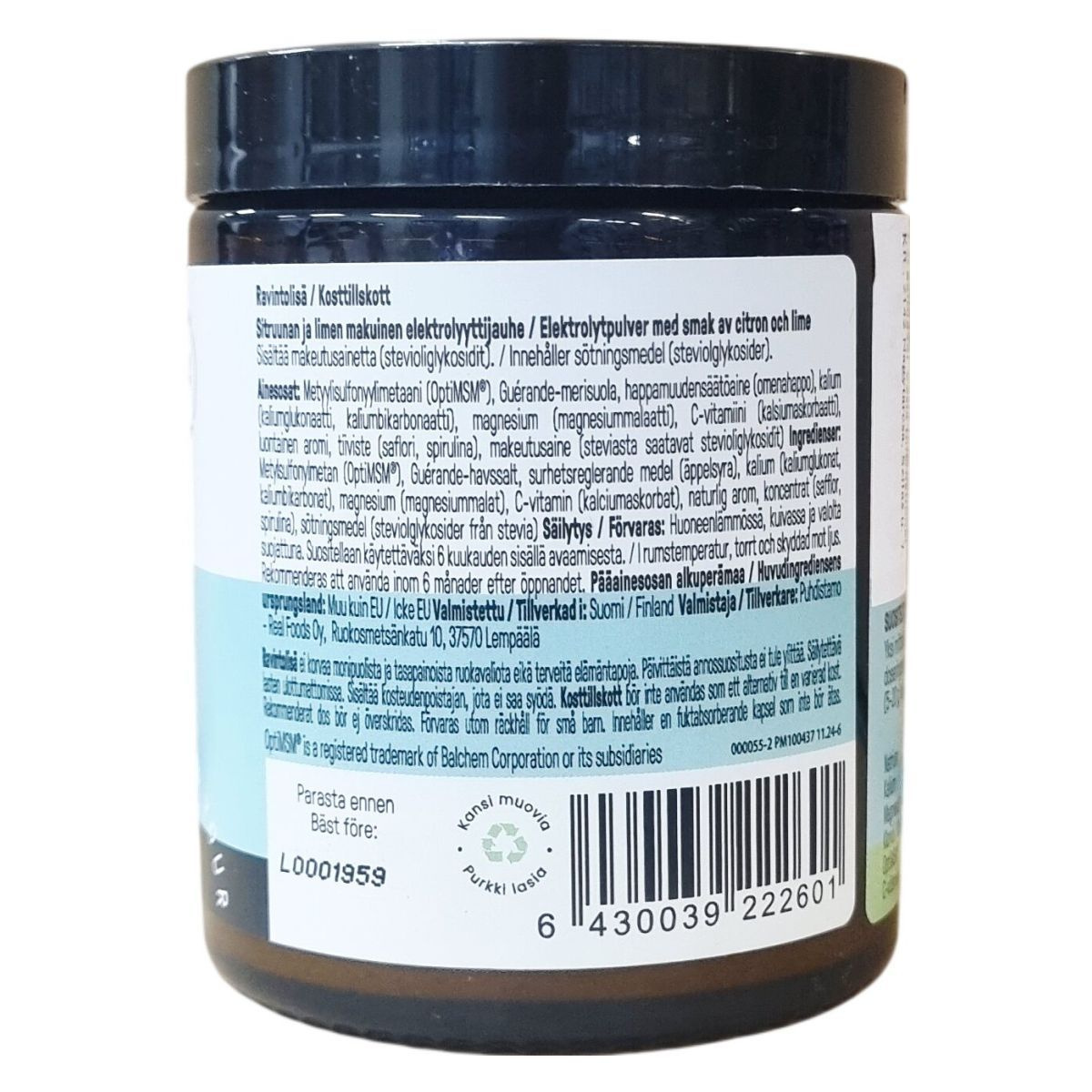 Citrom és lime ízű elektrolitpor. Édesítőszert (szteviol-glikozidok) tartalmaz. Fő összetevő származási helye: Európai Unión kívüli. Gyártva Finnországban. Nettó tömeg: 120 g. 24 adag. Vonalkód: 6430039222601.