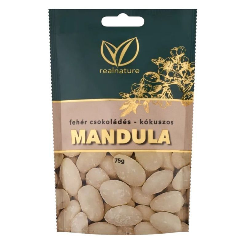 Kókuszos fehércsokoládéval bevont pörkölt mandula.