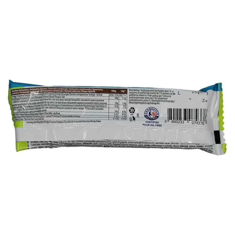 Összetevők: Fehércsokoládé 68%, cukor, sovány lejpor, tejzsír, laktóz, szójalecitin, teljes kiőrlésű barna rizs 25 %, citromsav magnézium sói 5,5%, napraforgó tahini, természetes kókusz aroma 0,2%.