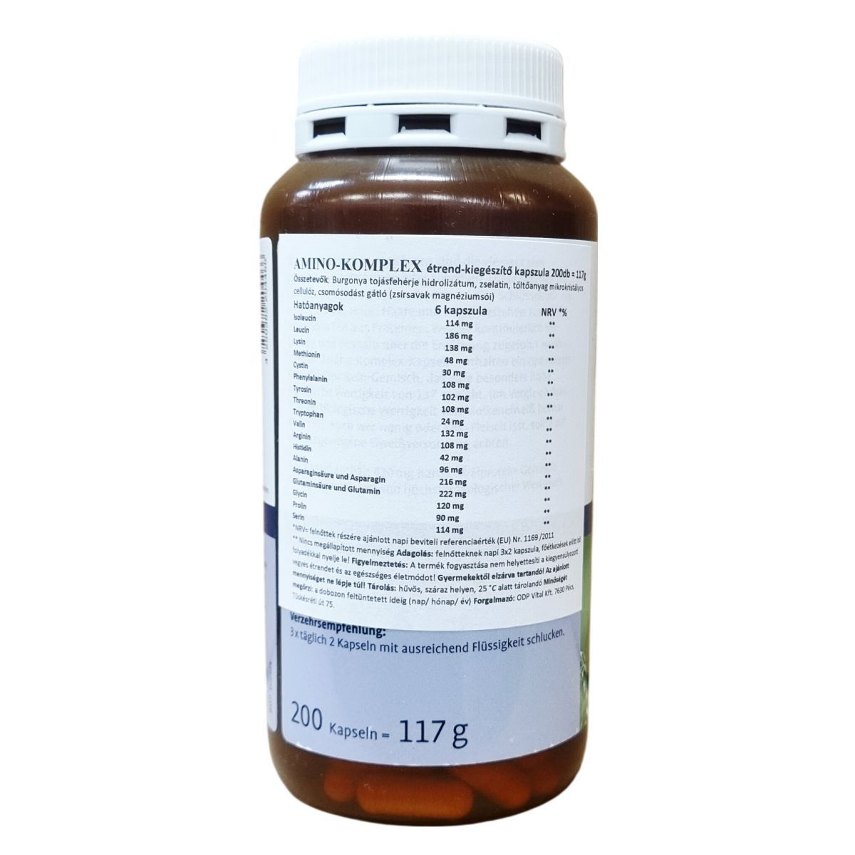 Az Amino-Komplex kapszula egy németországi gyártású étrend-kiegészítő, amely aminosavak széles skáláját tartalmazza, beleértve az esszenciális és nem esszenciális aminosavakat is. Minden kapszula burgonya tojásfehérje hidrolizátumot tartalmaz, amely könnyen felszívódó fehérjeforrás. A termék 200 darab kapszulás kiszerelésben, 117 gramm nettó súllyal érhető el. Az aminosavak mennyisége hat kapszulánként került megadva, amely felel meg a napi ajánlott mennyiségnek a gyártó utasítása szerint. A kapszulák zselatinból készülnek, töltőanyagként mikrokristályos cellulózt tartalmaznak, illetve csomósodásgátló anyagként zsírsavak magnéziumsóit alkalmazzák. Felhívjuk a figyelmet arra, hogy a termék nem helyettesíti a változatos és kiegyensúlyozott étrendet, valamint az egészséges életmódot, és nem ajánlott gyermekek számára. Ajánlott adagolási javaslat szerint naponta három alkalommal két kapszulát szükséges bő folyadékkal bevenni, főétkezések előtt. A termék tárolása száraz, fénytől védett helyen, 25 Celsius-fok alatt történjen.