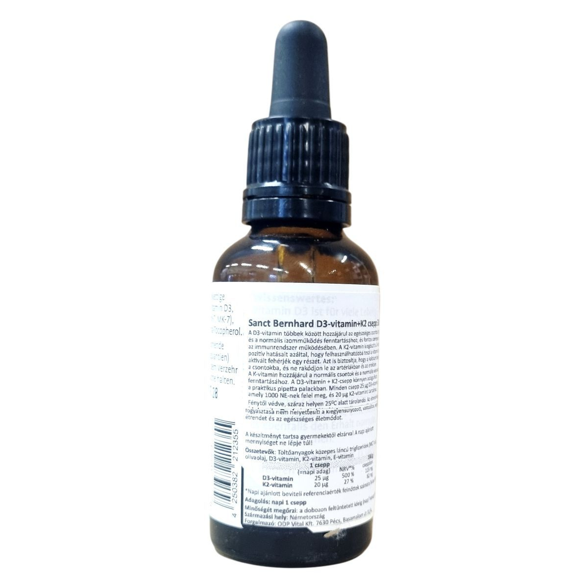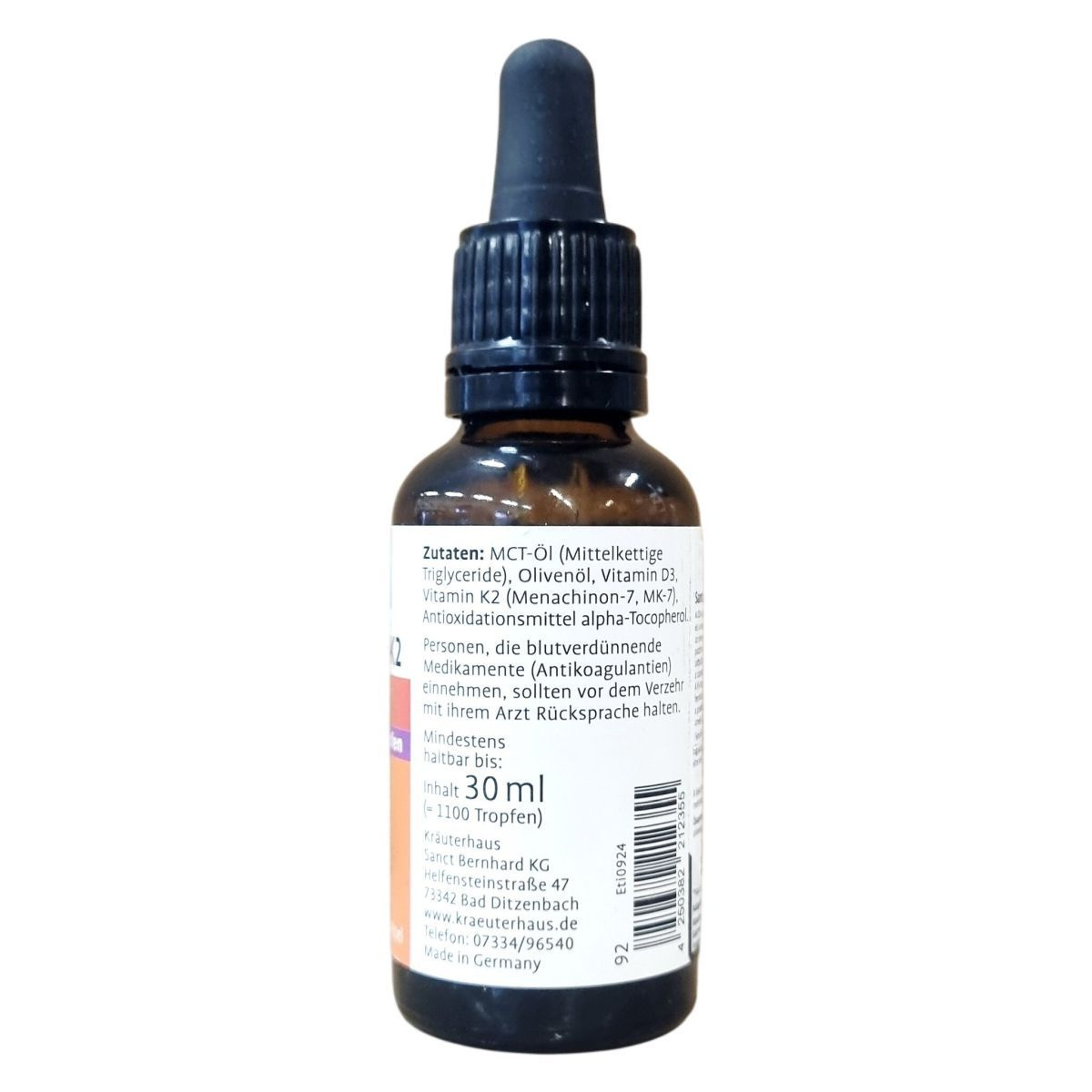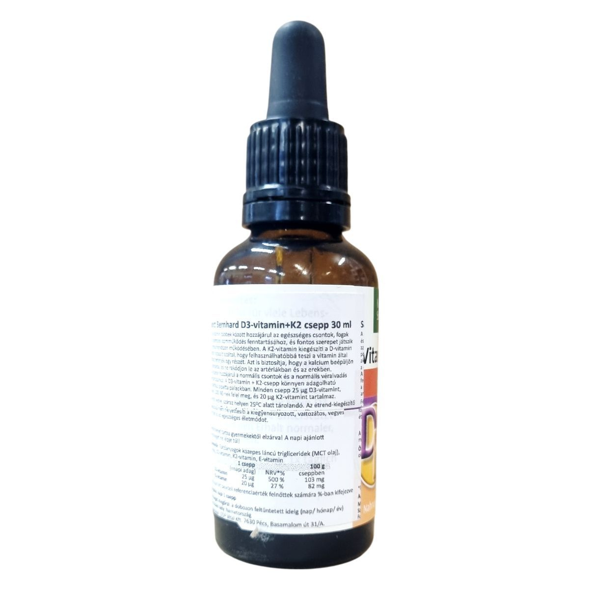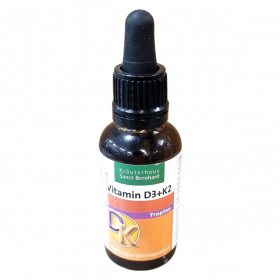 A Kräuterhaus Sanct Bernhard Vitamin D3+K2 csepp napi adagja 1 csepp, amely 25 µg D3-vitamint, vagyis 1000 NE-t, valamint 20 µg K2-vitamint tartalmaz. A K2-vitamin a D-vitamin hatásait egészítheti ki, elősegítheti a kalcium beépülését a csontokba, és hozzájárulhat a kalcium-érelmeszesedés megelőzéséhez. A termék közepes láncú triglicerideket (MCT olaj) és olivaolajat is tartalmaz, amelyek az aktív összetevők hordozójaként működnek. Az antioxidáns E-vitamin (alfa-tokoferol) védi a terméket az oxidációtól. Az adagolás praktikus pipettás üvegben történik, amely megkönnyíti a cseppentést. Az étrend-kiegészítő nem helyettesíti a kiegyensúlyozott, változatos étrendet és az egészséges életmódot.