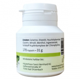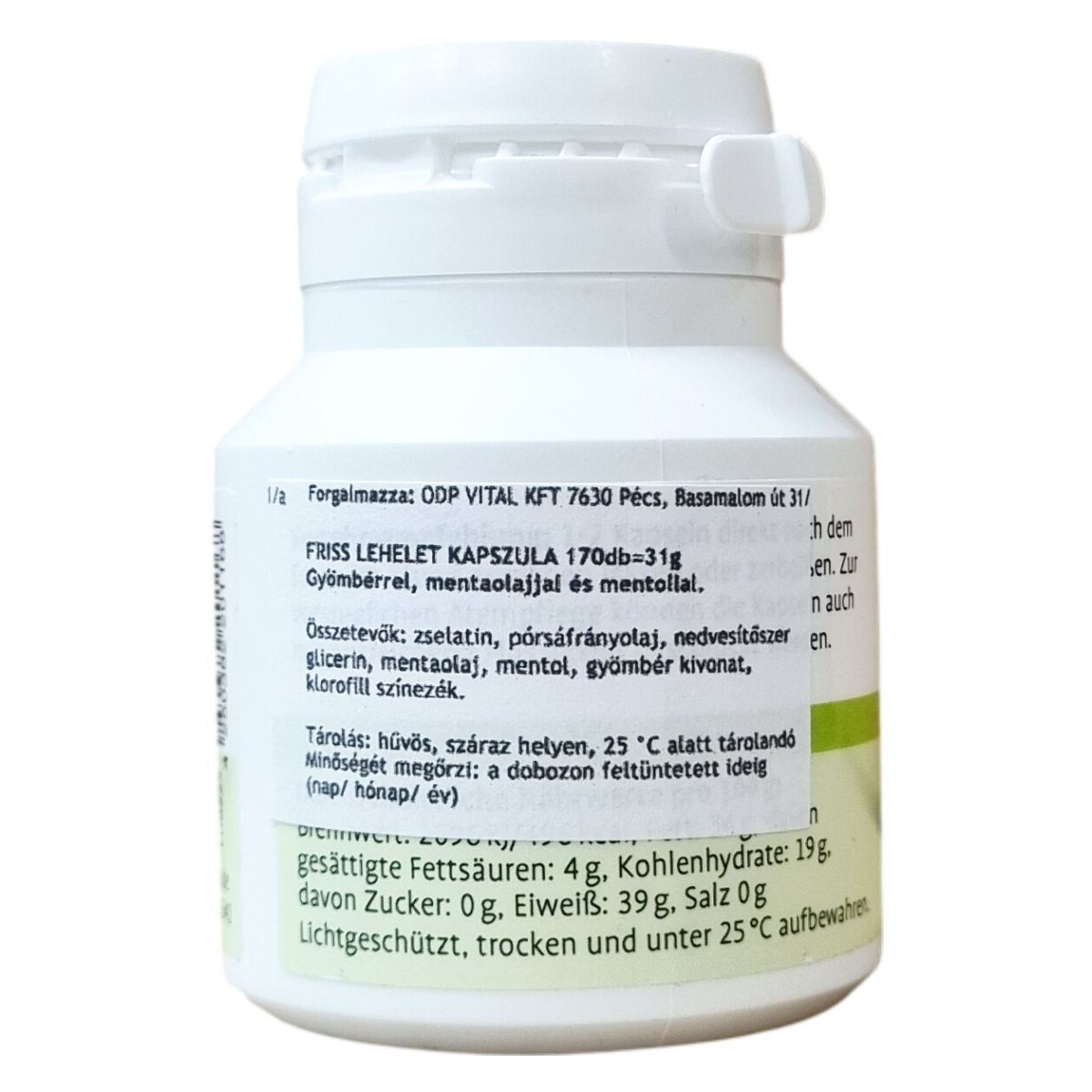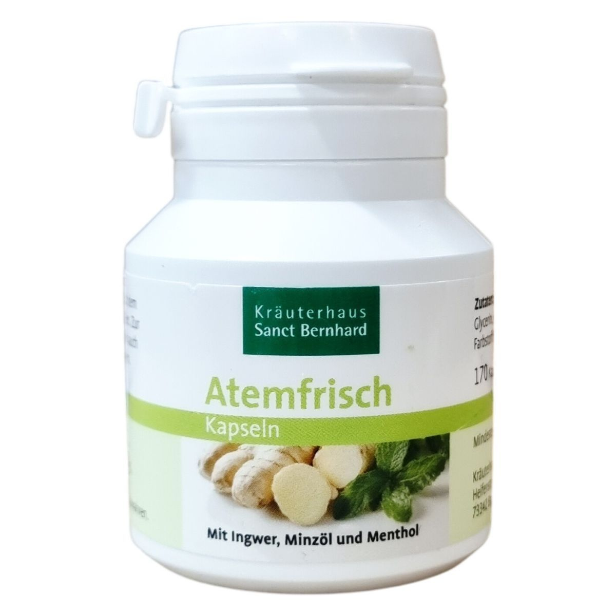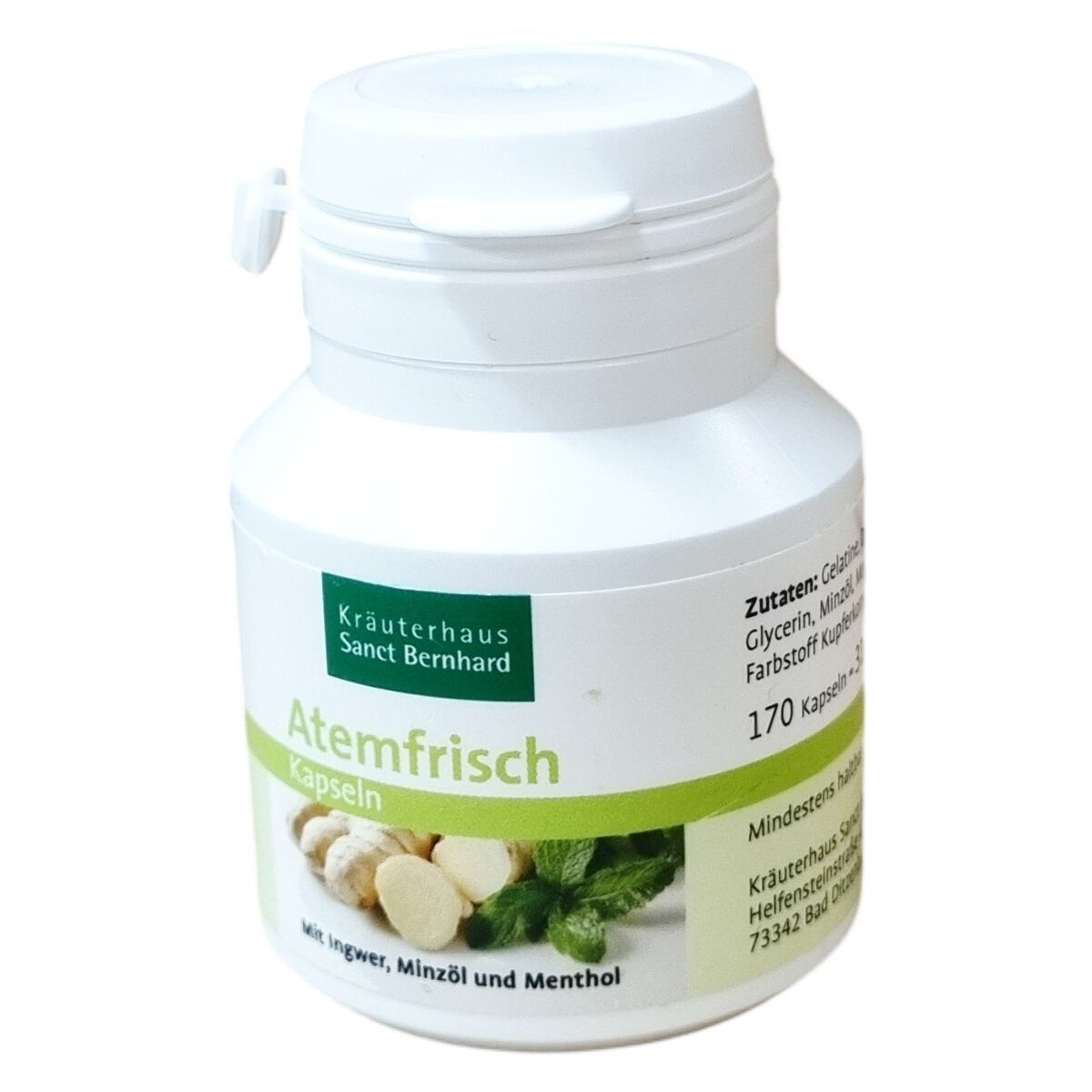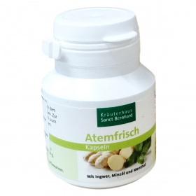 A Kräuterhaus Sanct Bernhard Atemfrisch kapszula 170 darabos kiszerelésben készül. Összetevői között megtalálható a zselatin, pórsáfrányolaj, nedvesítőszerként glicerin, valamint a frissítő összetevők, mint a mentaolaj, mentol és gyömbér kivonat. A kapszula színezékeként klorofill alapú rézkomplexeket tartalmaz. A termék különösen alkalmas lehet friss lehelet biztosítására, miközben könnyen tárolható hűvös és száraz környezetben 25 °C alatt. A termék magyarországi forgalmazója az ODP VITAL KFT, a gyártó pedig a német Kräuterhaus Sanct Bernhard KG.