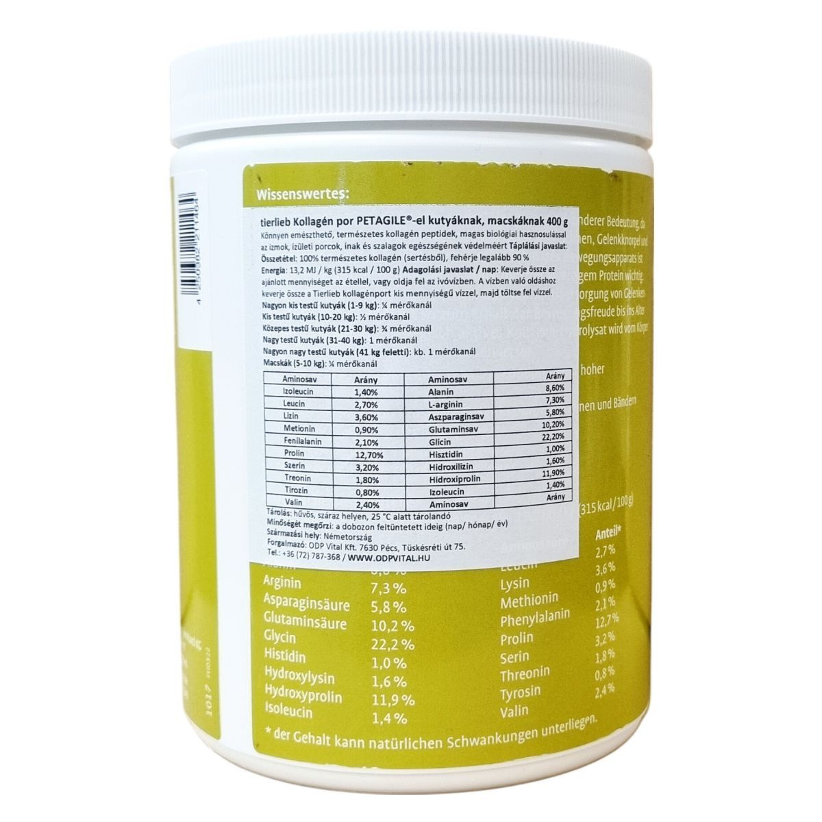 A tierlieb Kollagén por természetes kollagén peptideket tartalmaz, amelyek magas biológiai hasznosulással juthatnak el a szervezetbe. A termék különösen javasolt a mozgásszervi rendszer, így az izmok, ízületi porcok, inak és szalagok támogatására. A kollagén marhabőrből származik, amely hidrolízissel készül. Az adagolás rugalmasan alkalmazkodik a kutyák és macskák testtömegéhez. A por könnyen keverhető az ételbe vagy feloldható ivóvízben, előzőleg kevés vízzel elkeverve. A termék tárolása fénytől védve, száraz helyen ajánlott, a minőséget meghatározott ideig megőrzi. Származási helye Németország.