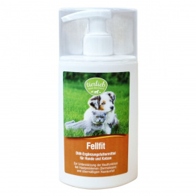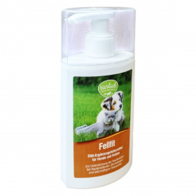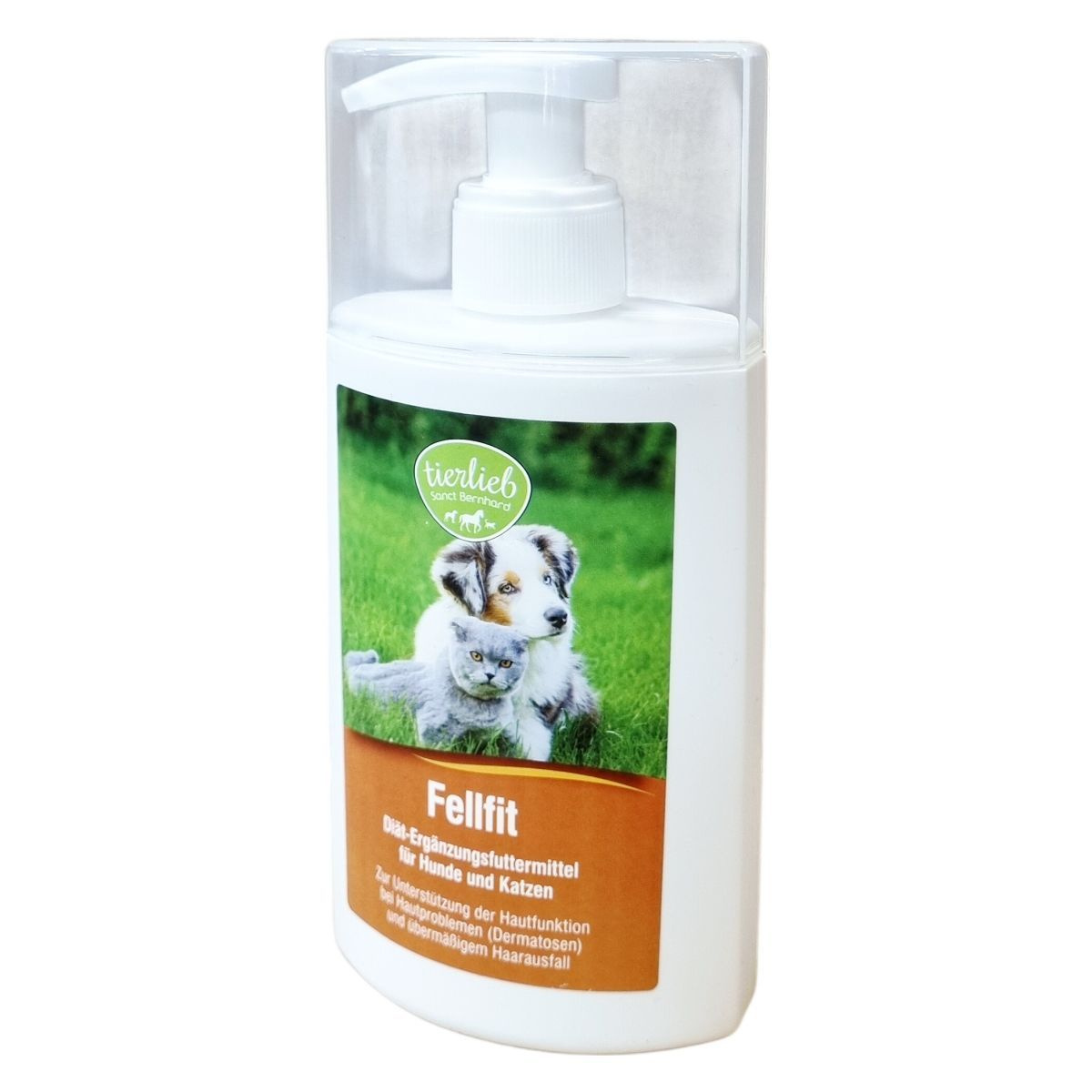A San Bernhard Fellfit szőr ápoló szirup olyan diétás étrend-kiegészítő készítmény kutyák és macskák számára, amely a bőrfunkciót támogatja különböző bőrproblémák, például dermatosis esetén, illetve csökkenti a fokozott szőrhullást. A termék 250 ml kiszerelésben érhető el. Az analitikai összetevők közé tartozik a nyersfehérje 1,5%, nyerszsír 75,9%, nyershamu 4,0%, és nyersrost 2,6%. A hatóanyagok dózisa 2 adagnyi pumpálásra vonatkozik különböző testsúlyok szerint, amelyek közé tartozik például 19 I.E. E-vitamin és 1018 I.E. A-vitamin 2 kg testsúlyra vetítve. A szirup összetevői a lazacolaj, ligetszépe olaj és köles kivonat, melyek hozzájárulnak a bőr egészségéhez és a szőrzet ápolásához. A termék Németországban készült, szigorú minőségi előírások szerint. A tárolásra vonatkozóan fontos, hogy a terméket hűvös, száraz helyen, 25 °C alatt kell tartani a megfelelő minőség megőrzése érdekében.