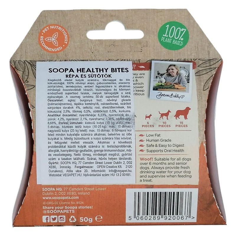 100% növényi alapú, gabonamentes, alacsony zsírtartalmú, természetes, emberi fogyasztásra is alkalmas minőségű összetevőkből készült, biztonságos és könnyen emészthető superfood falatok, melyek támogatják a száj egészségét. A csomag tartalma 50 db superfood falatka. Összetétel: egész burgonya liszt, tápióka keményítő, növényi glicerin (pálmaolajmentes), cellulóz rost, élesztőtermékek, szárított sárgarépa darabok 4%, bio kókuszolaj 2,5%, tökmag 0,5%, sütőtökliszt 0,5%, kurkuma. Analitikai összetétel: nyersfehérje: 5,71%, nyersolajok és -zsírok: 3,90%, nyersrost: 4,2%, nyershamu: 1,72%, nedvesség: 10,1%. Etetési útmutató: kistestyű kutya (10 kg alatt): max. 5 db/nap, közepes testű kutya (10-25 kg): max. 10 db/nap, nagytestű kutya (25 kg felett): max. 15 db/nap. 6 hónapos kor felett minden kutyafajta számára alkalmas, beleértve az idős kutyákat is. Mindig biztosítsunk a kutya számára friss ivóvizet, és felügyelet mellett etessük. Alkalmas a következő problémákkal küzdő kutyák számára is: testsúlyproblémák, allergiák, hasnyálmirigy-gyulladás, gyenge immunrendszer, máj- és vesebetegség.