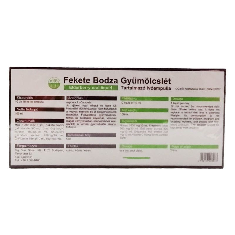 Összetevők: Méz 1000 mg/10 ml, Fekete bodza gyümölcslé 500 mg/10 ml, Goji bogyó kivonat 400mg/10 ml, Shizandra gyümölcs kivonat 200mg/10 ml, C-Vitamin 10mg/10 ml, tisztított víz.