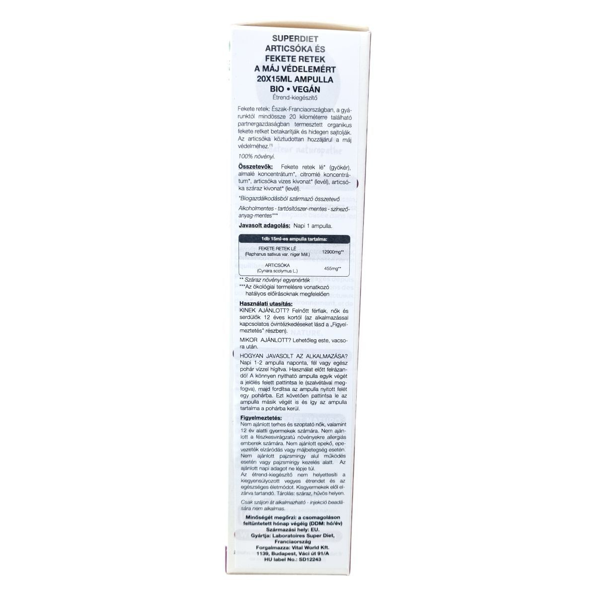 A termék fekete retekből és articsókából készült bio növényi koncentrátum, melynek alapanyagai Észak-Franciaországban, a gyártó közelében termesztett és hidegen sajtolt fekete retek, valamint levél- és száraz kivonat formában használt articsóka. A hidegsajtolásos módszer több mint 60 éves tapasztalatot tükröz. A formula nem tartalmaz alkoholt, tartósítószert és színezőanyagot, az összetevők mind biogazdálkodásból származnak. A termék használata javasolt felnőtt férfiaknak, nőknek és 12 éves kortól serdülőknek, különösen májvédelmi célból. Az ampullák könnyen nyithatóak, és használat előtt fel kell rázni őket. A termék kizárólag orális alkalmazásra készült, nem alkalmas injekciós beadásra. A precíz adagolás betartása és az egészséges életmód fenntartása ajánlott a készítmény alkalmazása mellett.