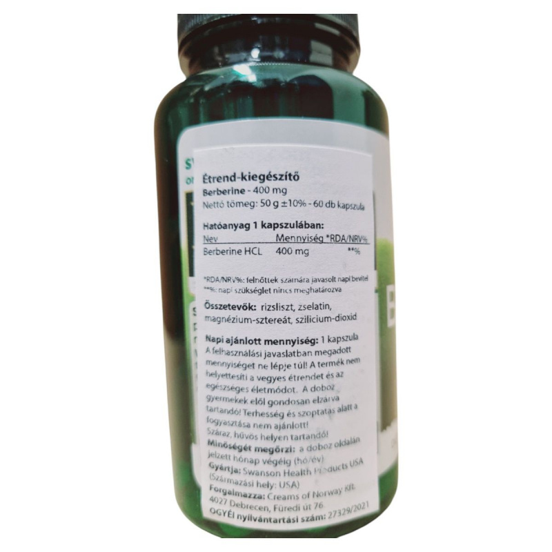 A Swanson Berberine étrend-kiegészítő kapszulánként 400 mg berberin HCL-t tartalmaz, amely hozzájárulhat az egészséges életmód támogatásához. A termék 60 kapszulás kiszerelésben érhető el, és rizsliszt, zselatin, magnézium-sztearát, valamint szilícium-dioxid összetevőket tartalmaz. A napi ajánlott mennyiség 1 kapszula, amelyet nem szabad túllépni. A termék nem helyettesíti a vegyes étrendet és az egészséges életmódot, és terhesség, valamint szoptatás alatt nem ajánlott a fogyasztása. A kapszulákat száraz, hűvös helyen kell tárolni, és gyermekek elől elzárva tartani. A terméket a Swanson Health Products USA gyártja, és az OGYÉI nyilvántartási száma 27329/2021.