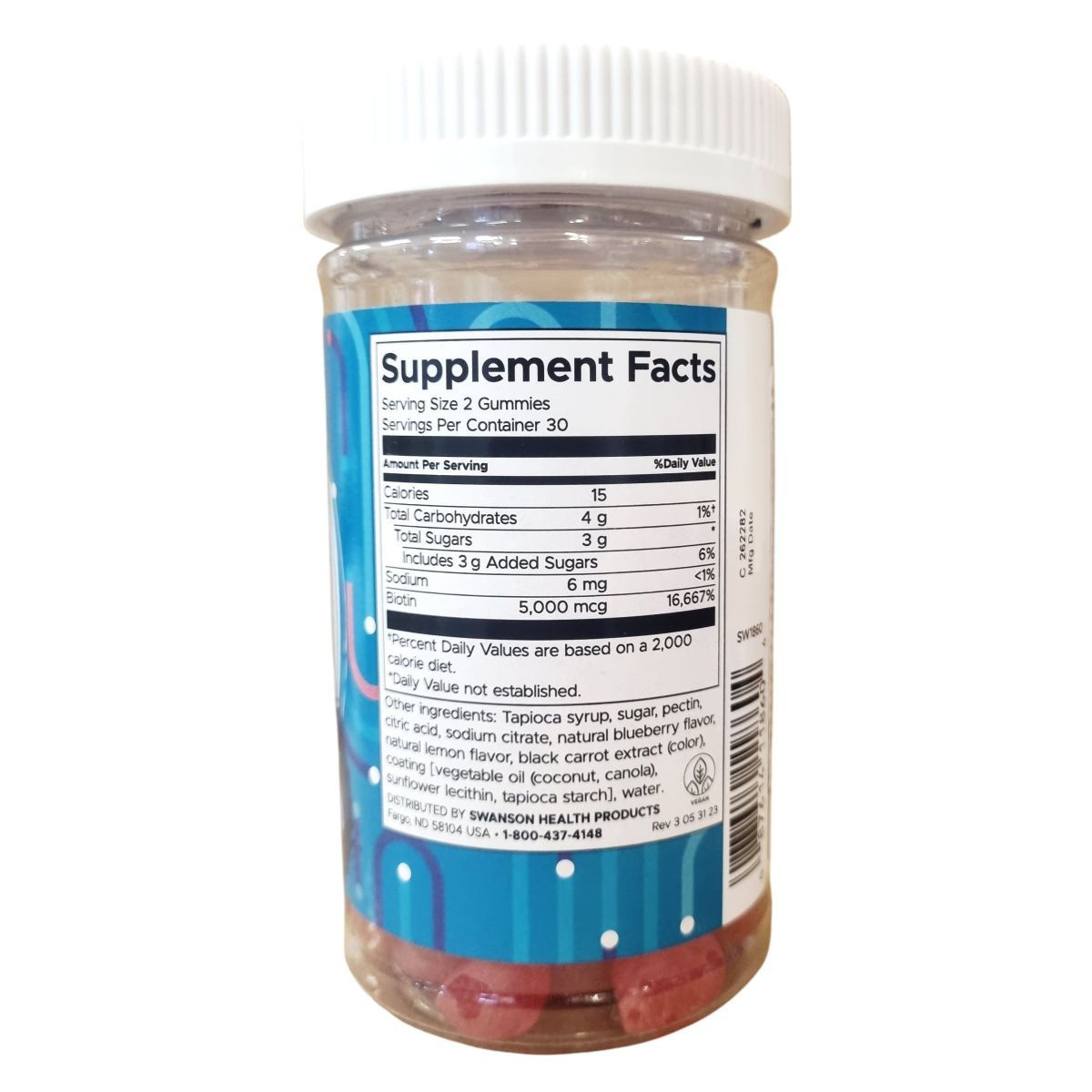 A SWANSON® Biotin gumivitamin Blueberry ízesítéssel készül az Egyesült Államokban. Egy adag 2 gumivitamint tartalmaz, melyek egyenként 2500 mcg biotint biztosítanak, ami az ajánlott napi bevitel 5000%-a. A termék nátriumot is tartalmaz, emellett glükóz szirupból, cukorból, pektinből, citromsavból, valamint természetes áfonya és citrom ízesítőkből és lila répalé koncentrátumból áll. A bevonat növényi olajat és karnauba viaszt tartalmaz. A termék vegán és gluténmentes, így különféle étrendi irányzatok mellett is fogyasztható. Fontos, hogy a napi ajánlott mennyiséget ne lépjük túl, és a termék nem helyettesíti a kiegyensúlyozott étrendet és az egészséges életmódot. Terhesség és szoptatás alatt a fogyasztása nem ajánlott. A dobozt gyermekektől elzárva kell tartani. A minőség megőrzése érdekében száraz, hűvös helyen tárolandó, a gyártástól számított 2 évig felhasználható.