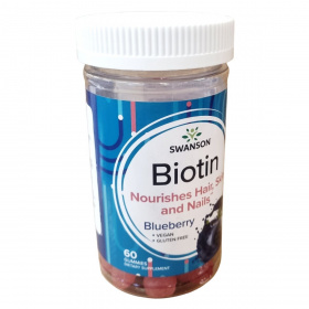 A Biotin gumivitamin különféle összetevőkből álló táplálékkiegészítő, amely a haj, a bőr és a körmök ápolására lehet alkalmas, természetes áfonya ízesítéssel.