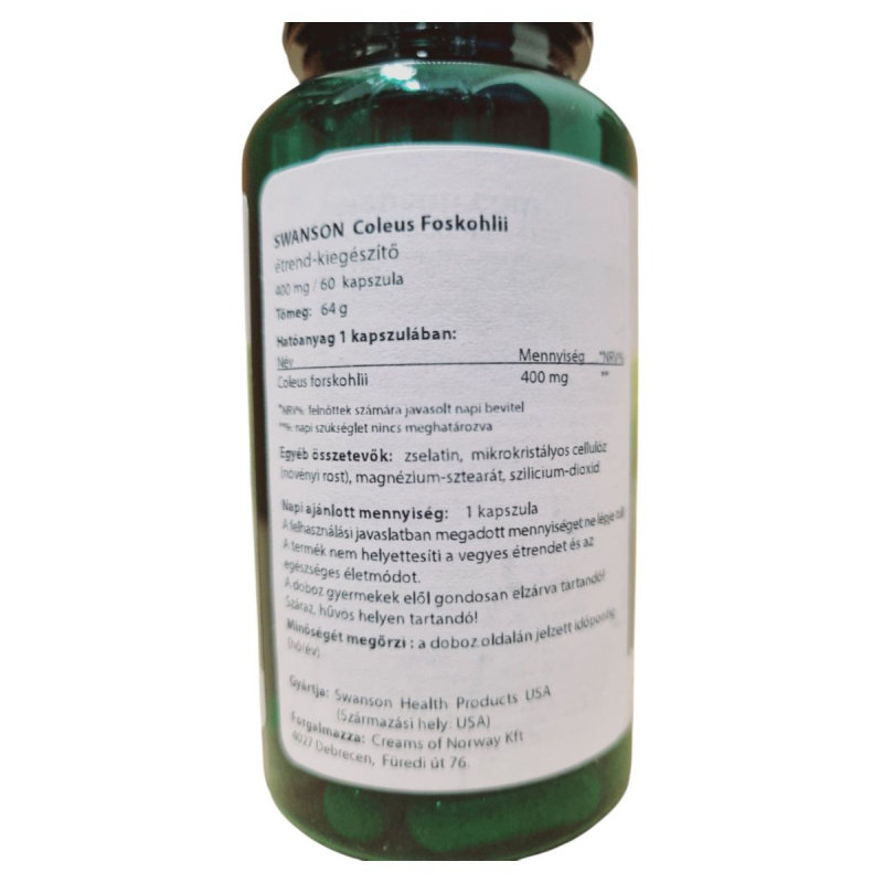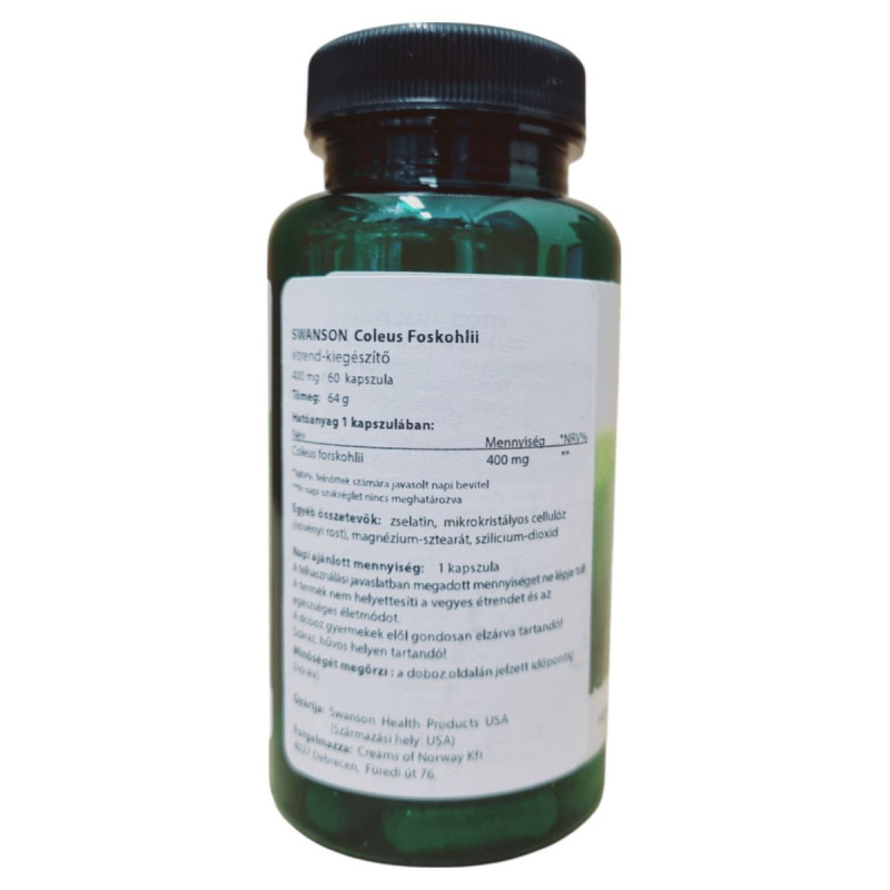 A SWANSON Coleus Foskohlii étrend-kiegészítő egy 60 kapszulás kiszerelésű termék, amely kapszulánként 400 mg Coleus forskohlii gyökér kivonatot tartalmazhat. Az étrend-kiegészítő zselatin, mikrokristályos cellulóz, magnézium-sztearát és szilícium-dioxid összetevőket is tartalmaz. A termék napi ajánlott adagja 1 kapszula, amelyet nem szabad túllépni. Fontos, hogy a termék nem helyettesíti a vegyes étrendet és az egészséges életmódot. A terméket száraz, hűvös helyen kell tárolni, és gyermekek elől elzárva tartani. A terméket a Swanson Health Products USA gyártja, és a Creams of Norway Kft forgalmazza Magyarországon.